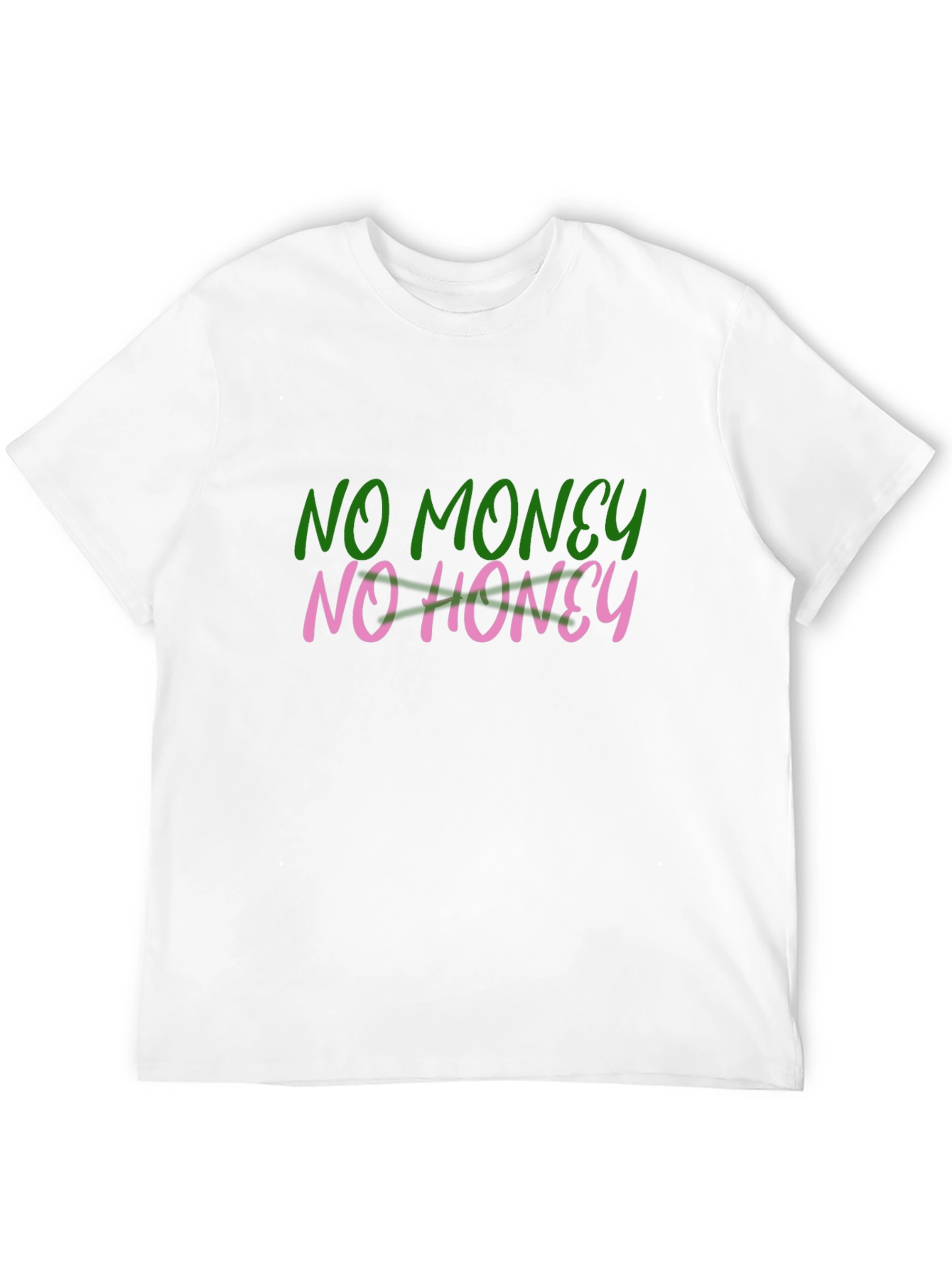 Show off your humor with this black t-shirt featuring the witty statement "No Money No Honey". The shirt features vibrant green and pink text, and a classic fit for comfort. It's a perfect casual wear option that combines style and a touch of humor. Wear it to casual outings, parties, or simply as a statement piece in your everyday wardrobe. Grab yours now!