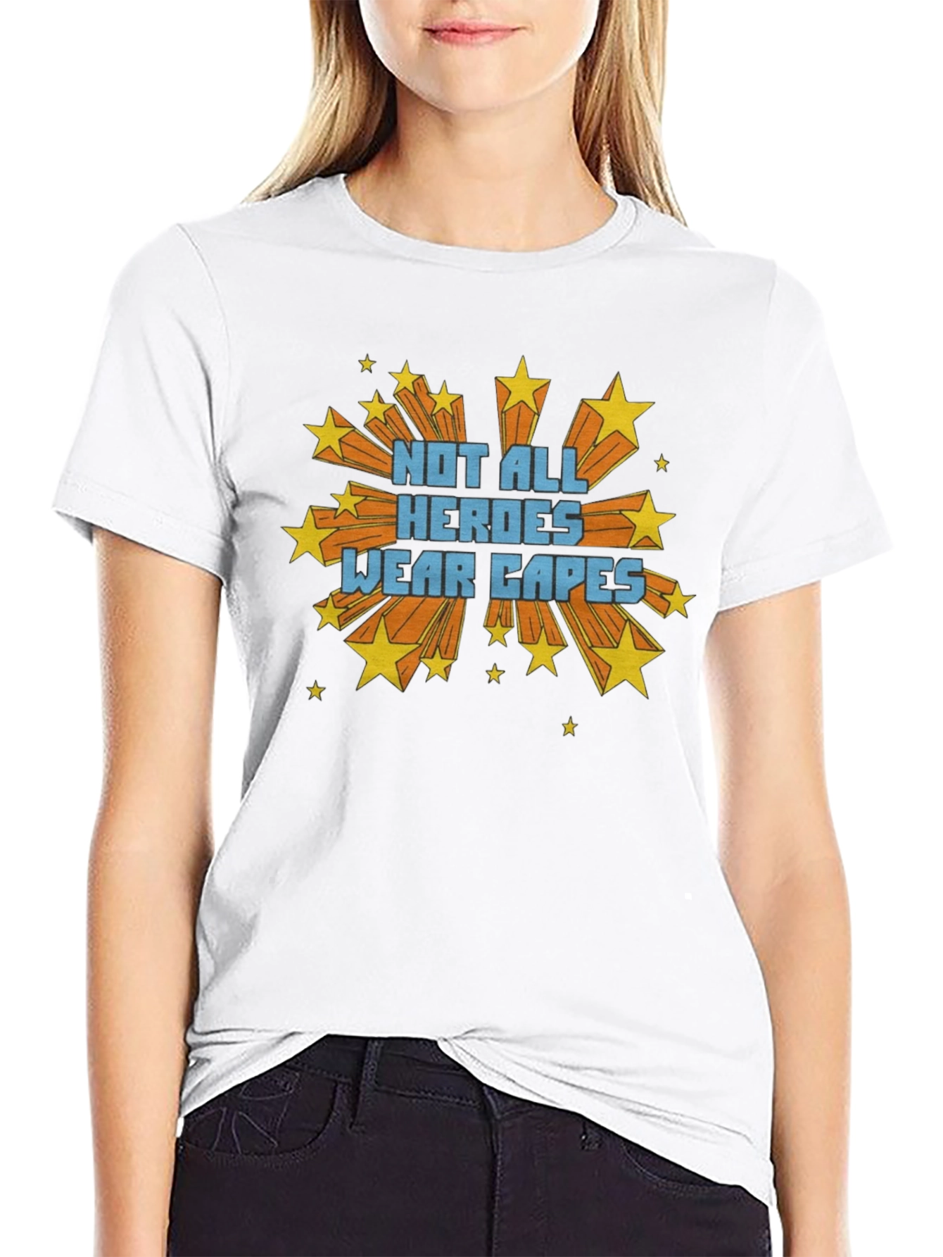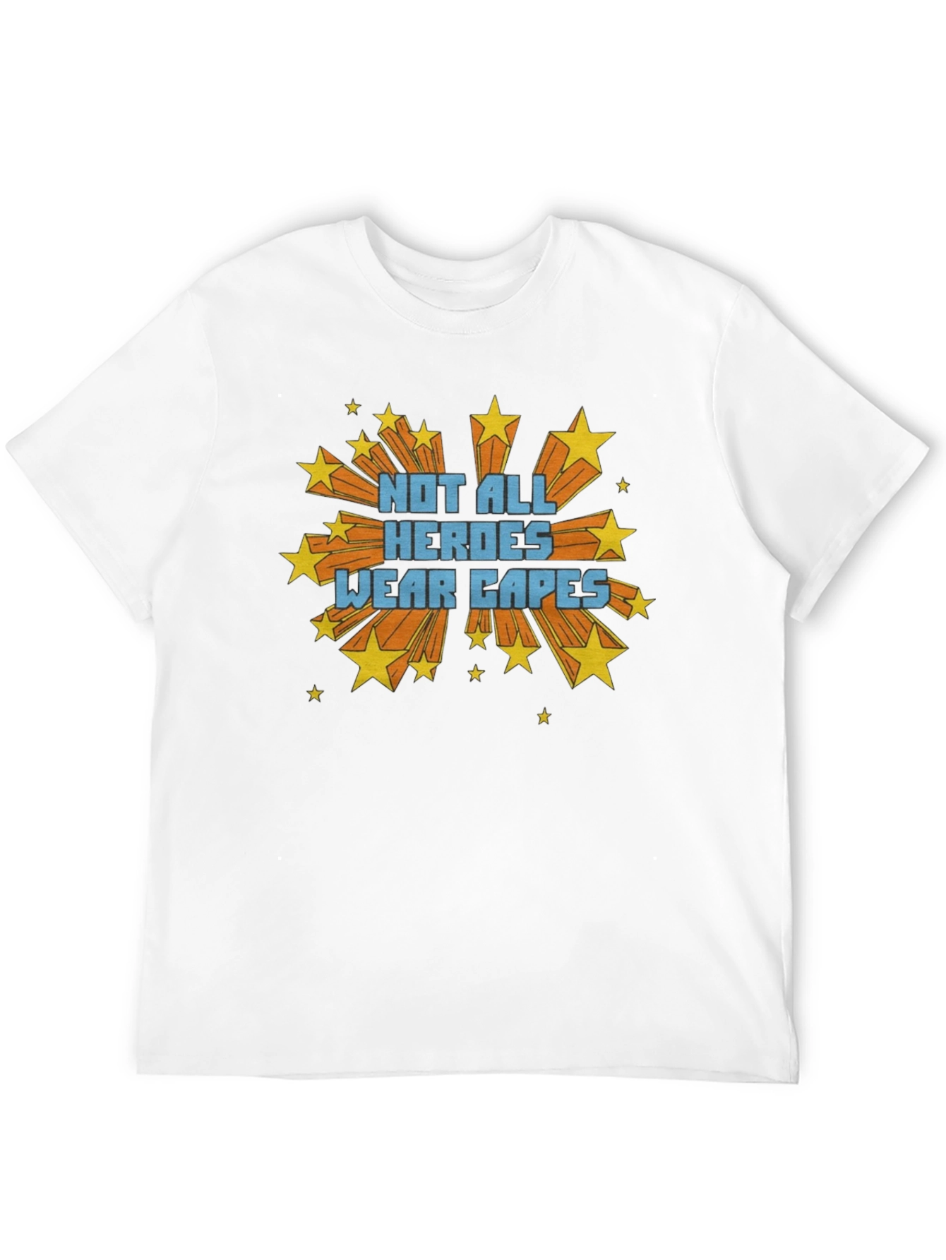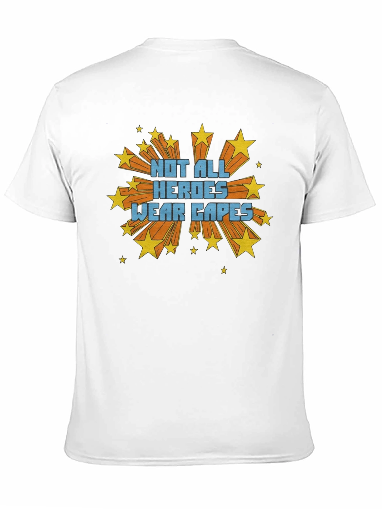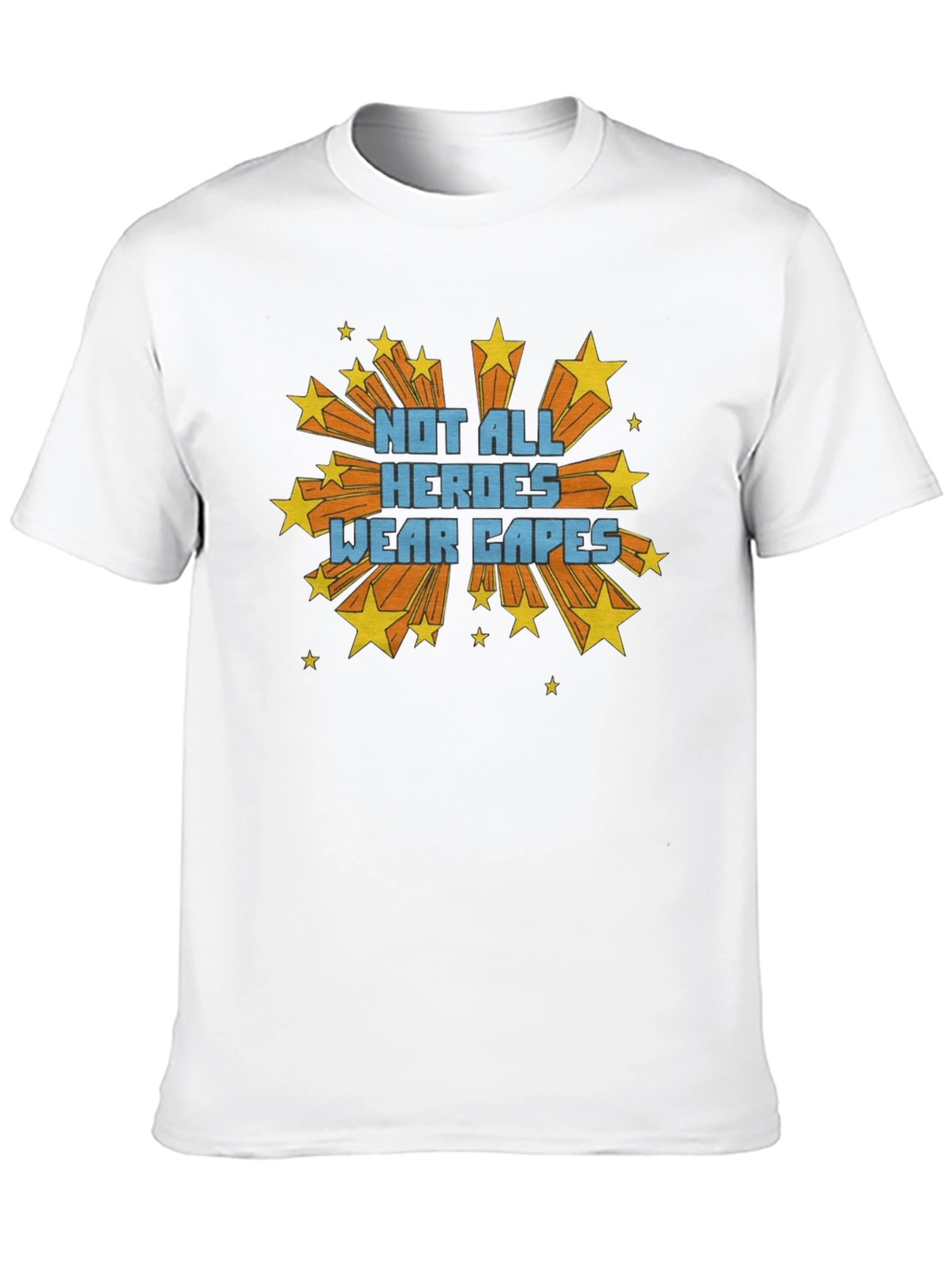 Show your appreciation for everyday heroes with this striking black graphic tee. The shirt features a vibrant, eye-catching design with the words "NOT ALL HEROES WEAR CAPES" in a retro, stylized font. Golden yellow stars burst from behind the text, adding to the heroic vibe. Crafted from comfortable, breathable fabric, this tee is perfect for casual wear, whether you're running errands or relaxing with friends. It's a great conversation starter and a subtle way to acknowledge those who make a difference in our lives. This shirt is a stylish and meaningful addition to any wardrobe. A perfect gift for anyone who appreciates a clever design.