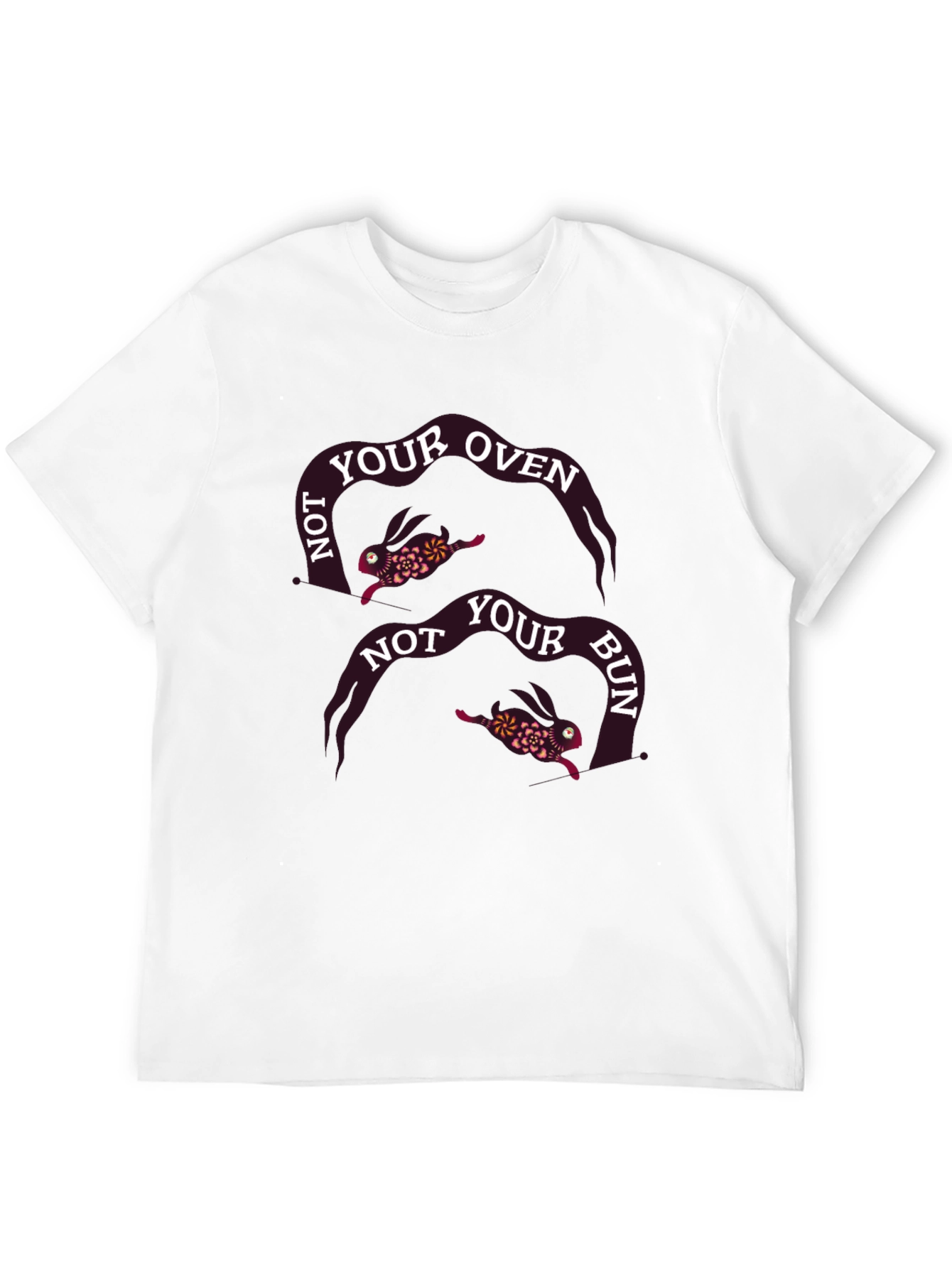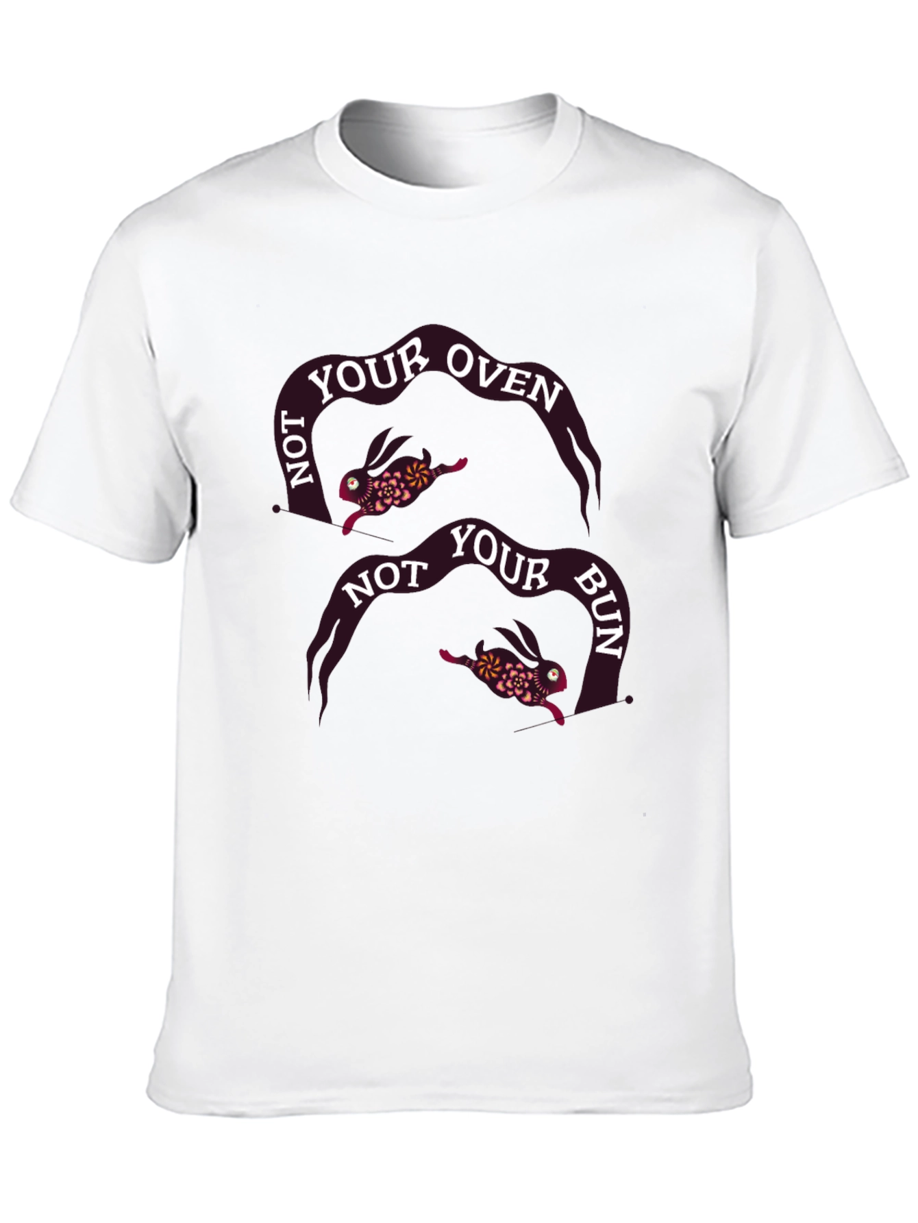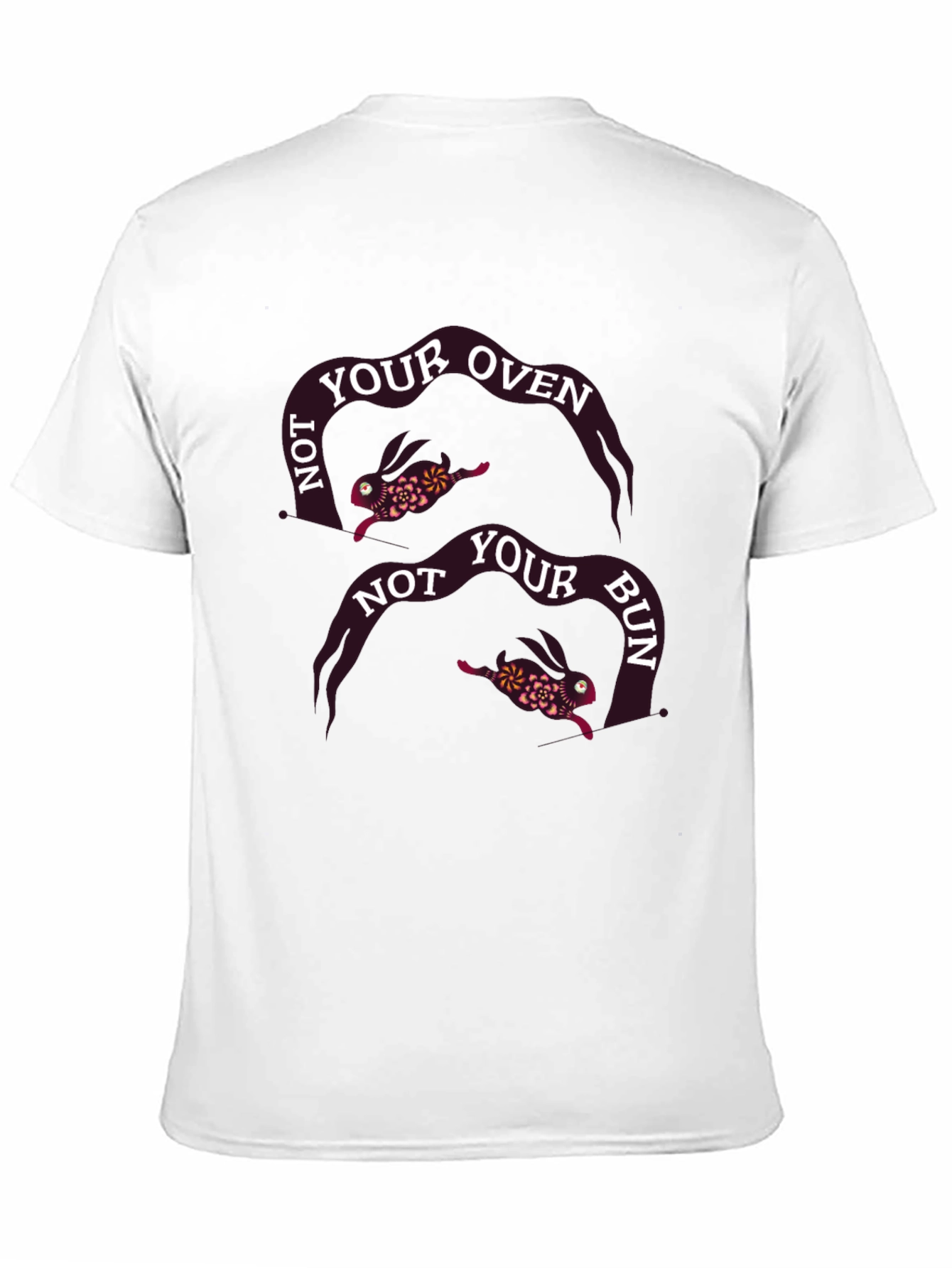 Show your support for rabbit rights with this stylish black t-shirt. This tee features a unique graphic design with the phrase "Not Your Oven, Not Your Bun" arranged around two adorable rabbits. Made from a comfortable, breathable fabric, this t-shirt is perfect for everyday wear and casual outings. The bold design is sure to turn heads and spark conversations. Wear it to your next animal rights rally, a casual get-together, or simply to express your passion for animal welfare. A must-have for any animal lover's wardrobe.