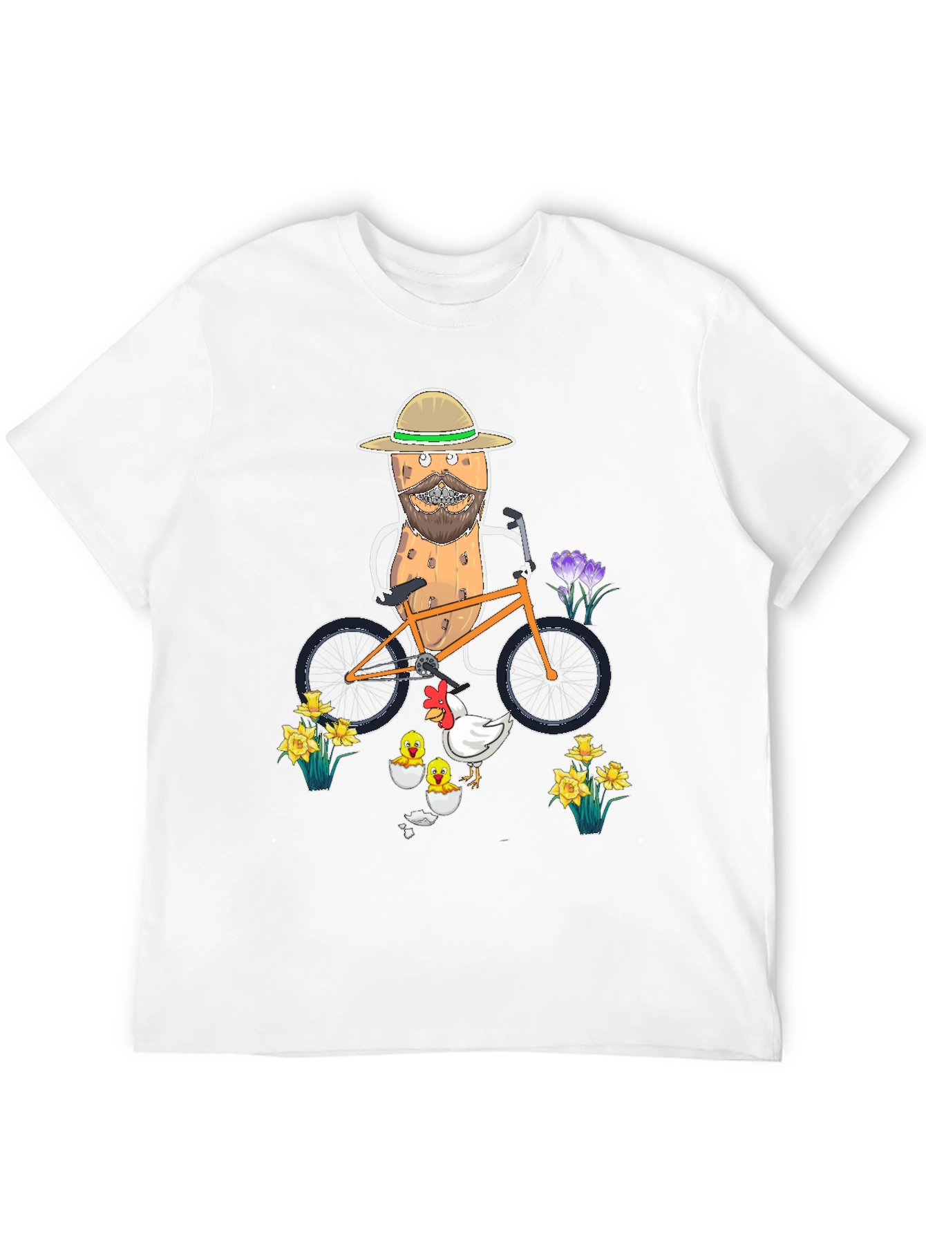 This unique t-shirt features a whimsical graphic of a potato character with a beard and hat riding a bicycle. The design also includes a chicken with newly hatched chicks surrounded by spring flowers like daffodils and crocuses, adding a playful touch. Made from a comfortable fabric, this black tee is perfect for casual wear and makes a statement with its eye-catching, quirky design. Great for those who love novelty shirts and unique, conversation-starting pieces. Ideal for everyday wear, casual outings, or as a fun gift for a friend.