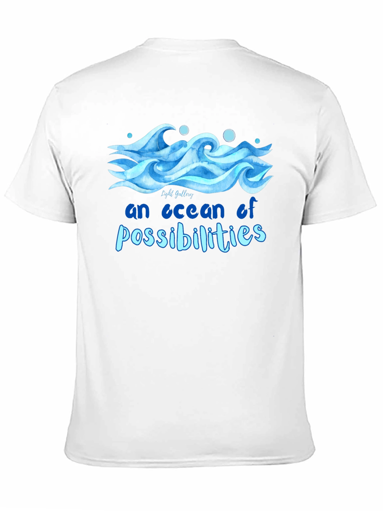 Ride the wave of style with this unique graphic tee! Made from a comfortable-looking black fabric, this t-shirt features a striking design of stylized blue waves accompanied by the inspiring phrase "an ocean of possibilities". The design evokes a sense of freedom, adventure, and limitless potential. Perfect for casual wear, beach outings, or anyone who loves the ocean. This eye-catching tee will surely become a favorite in your wardrobe. Show off your positive attitude and embrace the possibilities that lie ahead with this must-have t-shirt!