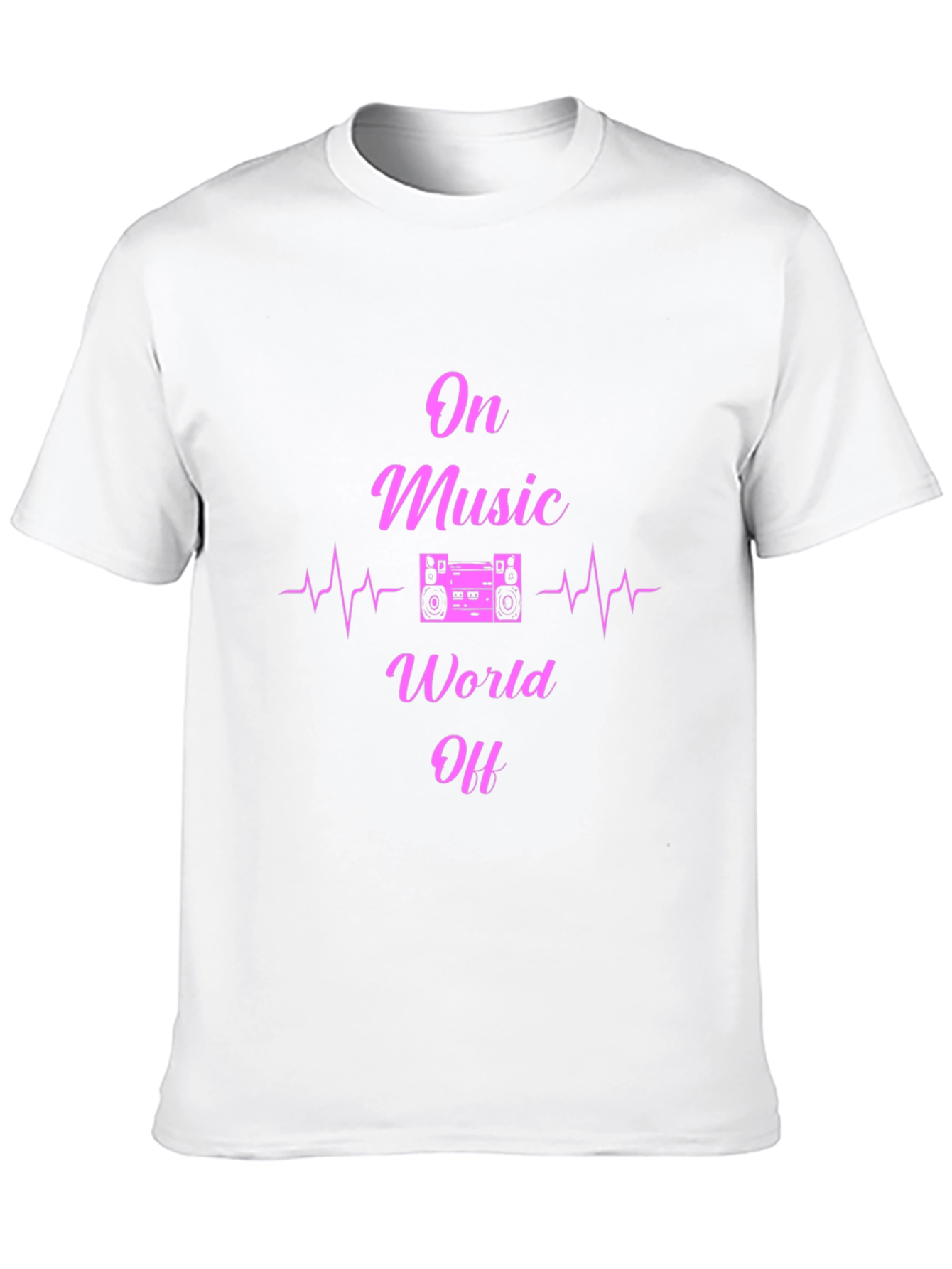 Rock your style with this cool black t-shirt. Featuring a vibrant pink graphic that says "On Music World Off" surrounding a retro boombox, this shirt is perfect for music lovers. The heartbeat-style lines add a dynamic touch. Made from comfortable materials, it's ideal for casual wear, concerts, or just hanging out. Stand out and express your passion for music with this unique tee.