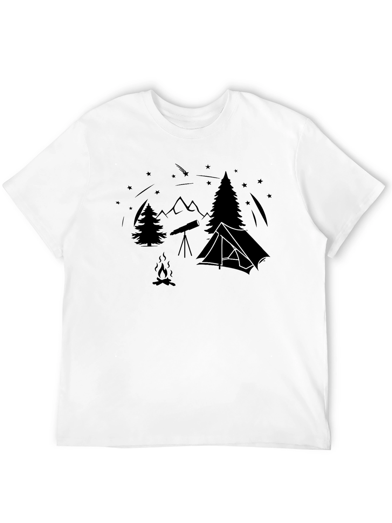 Embrace your love for nature with this unique black graphic tee. Featuring a detailed print of a camping scene, including a tent, trees, a telescope under a starry sky, and a cozy campfire, this shirt is perfect for outdoor enthusiasts. The design captures the essence of a night under the stars, making it an ideal choice for casual wear or your next adventure. Made from comfortable materials, this tee offers a great fit and lasting durability. Show off your adventurous spirit with this must-have addition to your wardrobe. Get yours today and let the journey begin!