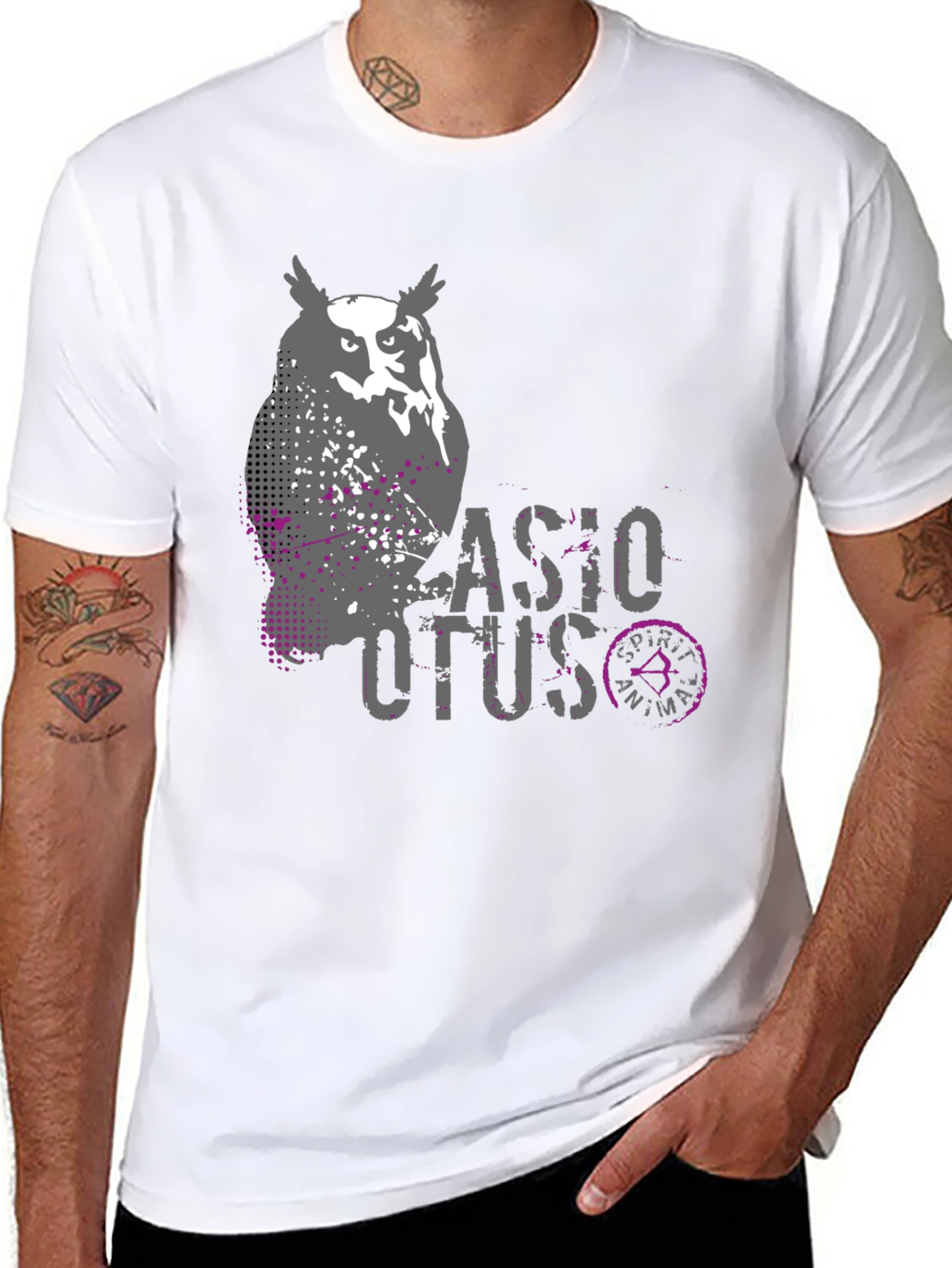 Showcase your unique style with this bold, black men's t-shirt. The shirt features a striking graphic print of an owl, rendered in shades of gray and accented with artistic purple splatter details. The words "ASIO OTUS" are printed next to the owl with the phrase "Spirit Animal". Made from a soft, breathable fabric, this tee offers both comfort and durability for everyday wear. Perfect for casual outings, concerts, or expressing your individuality. Pair it with jeans or shorts for a relaxed yet stylish look. This unique owl graphic tee is sure to turn heads.