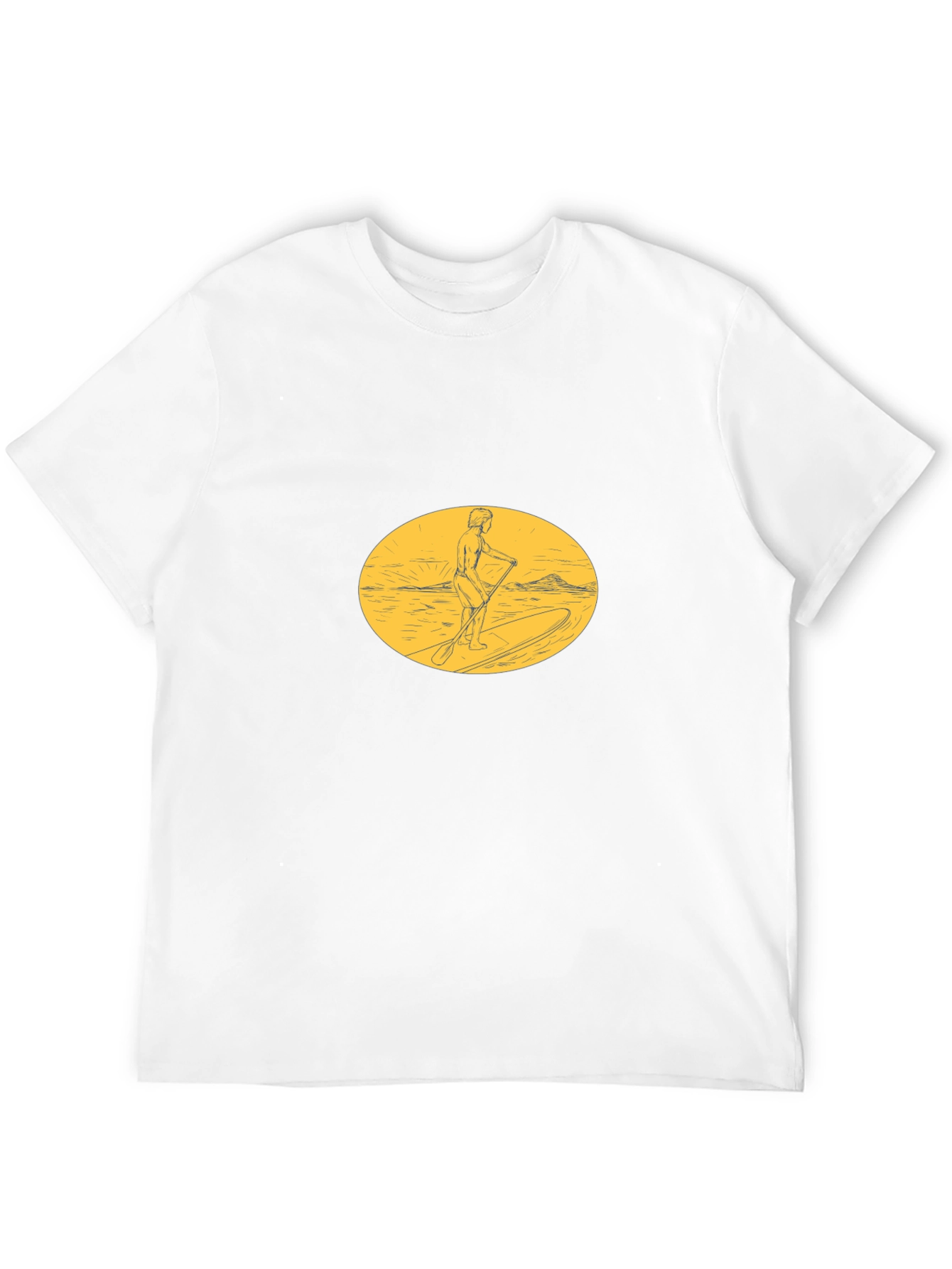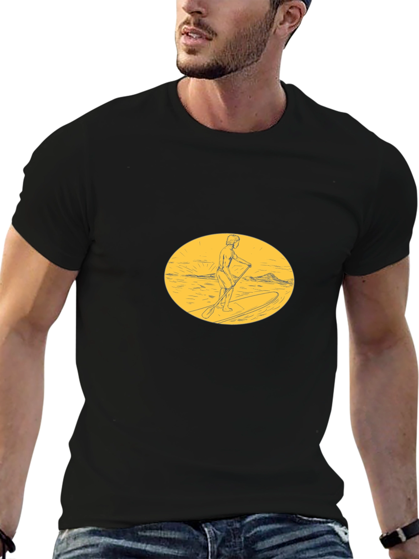 Show off your love for water sports with this stylish black t-shirt! Featuring a vibrant golden yellow oval graphic, the design depicts a person paddleboarding against a sunny seascape. This classic tee is made from a comfortable-looking fabric and has a regular fit. The smooth texture and dark color make it versatile for casual outings, workouts, or lounging at home. Dress it up with jeans or dress it down with shorts for a cool, effortless look. Get yours today and enjoy both comfort and style!