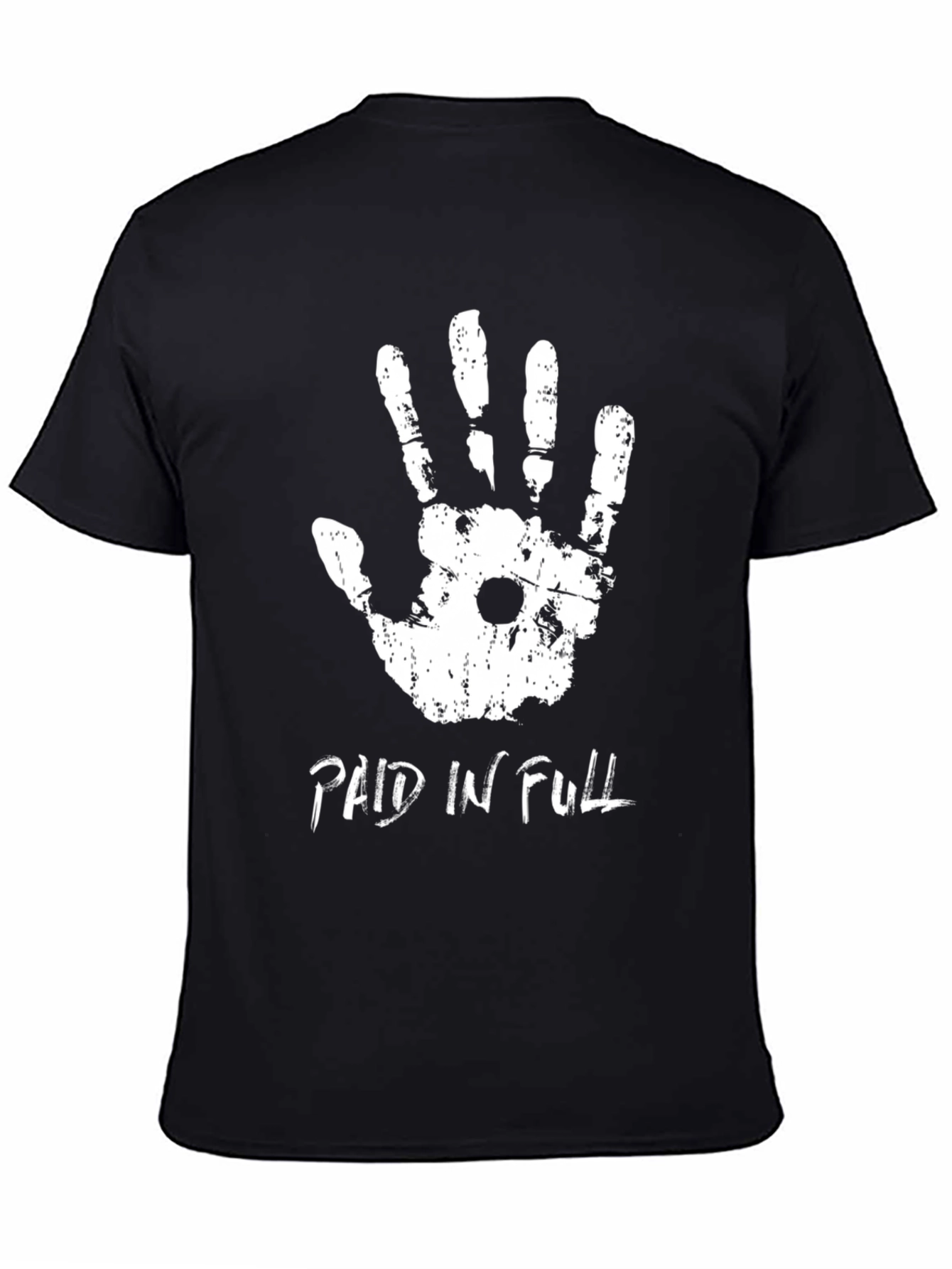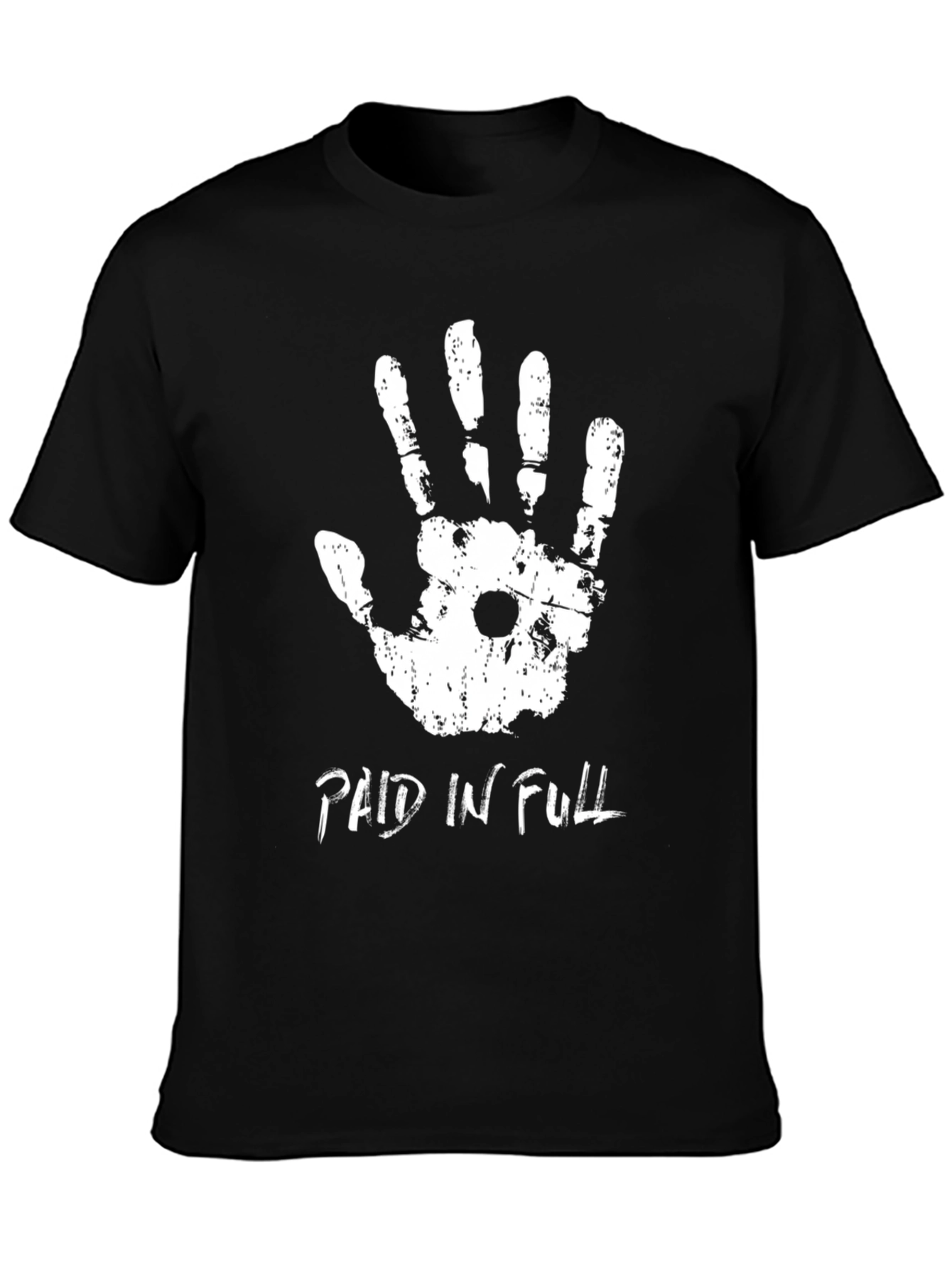 Show off your edgy style with this black crew neck t-shirt. Featuring a distressed white handprint graphic and the words "Paid In Full" in a matching font, this shirt is sure to turn heads. Made from a comfortable-looking cotton blend, this short-sleeve tee is perfect for casual everyday wear. The bold graphic makes a statement, while the classic fit ensures all-day comfort. Pair it with jeans or shorts for an effortlessly cool look. This unique t-shirt is a must-have for anyone who wants to stand out from the crowd.