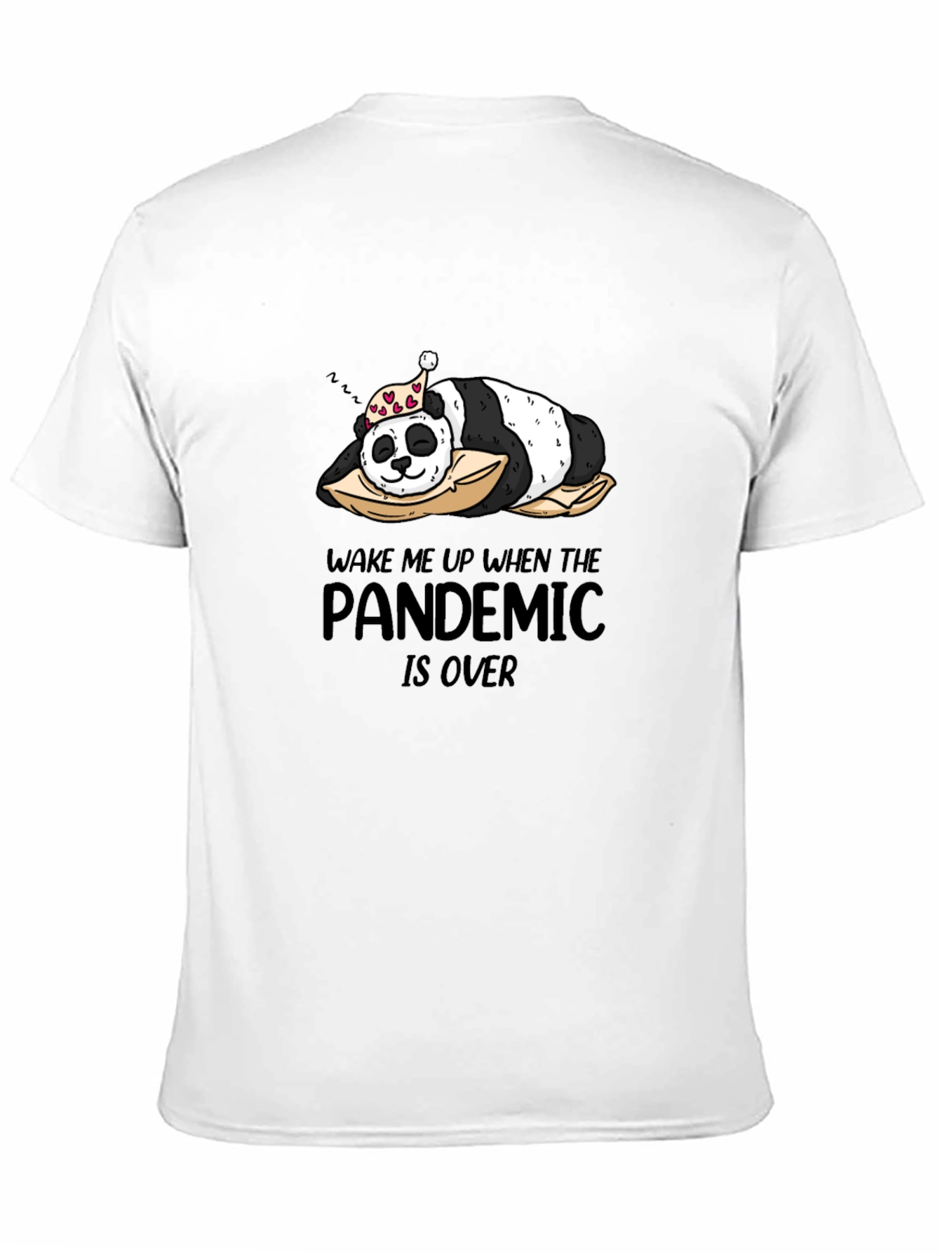 Embrace your inner homebody with this comfortable and stylish black t-shirt. Featuring a whimsical graphic of a sleeping panda wearing a heart-adorned hat, resting peacefully on a pillow. Above the panda it says "Wake me up when the Pandemic is over". This unique design speaks to the shared sentiment of wanting to fast-forward through challenging times. Made from soft, breathable cotton, this tee is perfect for lounging at home, casual outings, or as a conversation starter. The bold black color provides a versatile backdrop for the playful graphic, making it easy to pair with jeans, shorts, or leggings. A fun and relatable addition to any wardrobe!