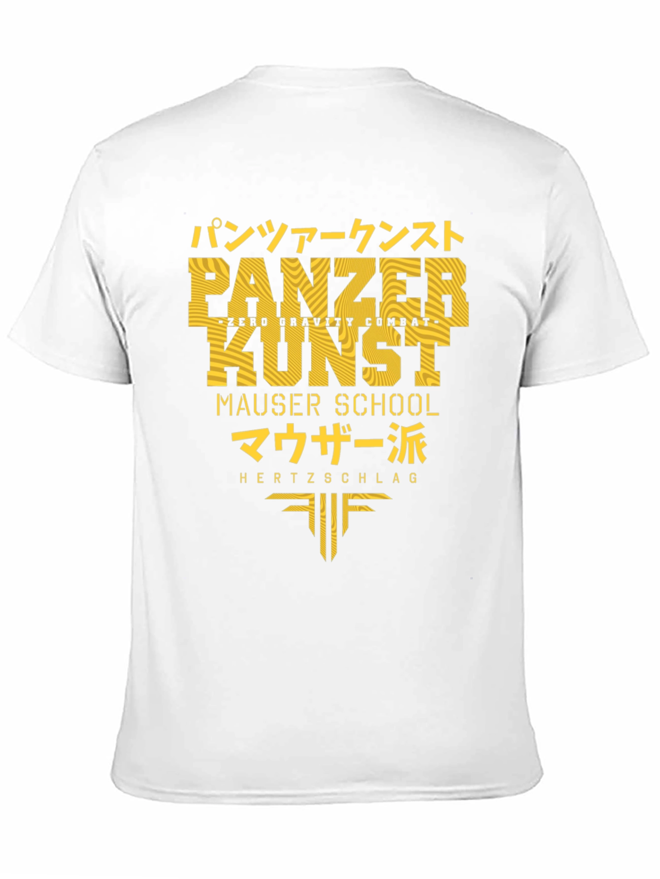 Showcase your unique style with this eye-catching black t-shirt. Featuring a striking yellow graphic design with "Panzer Kunst" and Japanese lettering, this tee makes a bold statement. The design also includes "Mauser School," and a stylized symbol. Crafted from a comfortable material, this tee is perfect for casual wear, expressing your individuality, and making a memorable impression. Wear it to concerts, social events, or simply as a daily conversation starter. This unique shirt is a must-have for anyone who loves distinct fashion.