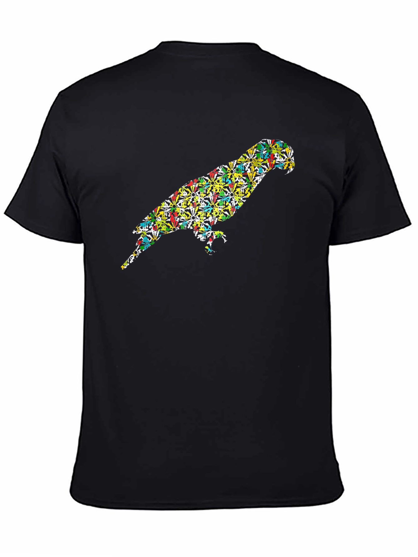 Show off your unique style with this eye-catching black t-shirt. The shirt features a vibrant, multi-colored parrot design, filled with a repeating pattern. Made from a comfortable, breathable fabric, this tee is perfect for everyday wear. The classic crew neck and short sleeves provide a timeless fit, while the bold graphic adds a playful touch. Whether you're heading to a casual hangout or want to make a statement, this parrot print t-shirt is a great choice. Pair it with jeans, shorts, or your favorite bottoms for a fun, stylish look. Make a statement and elevate your wardrobe with this standout piece.