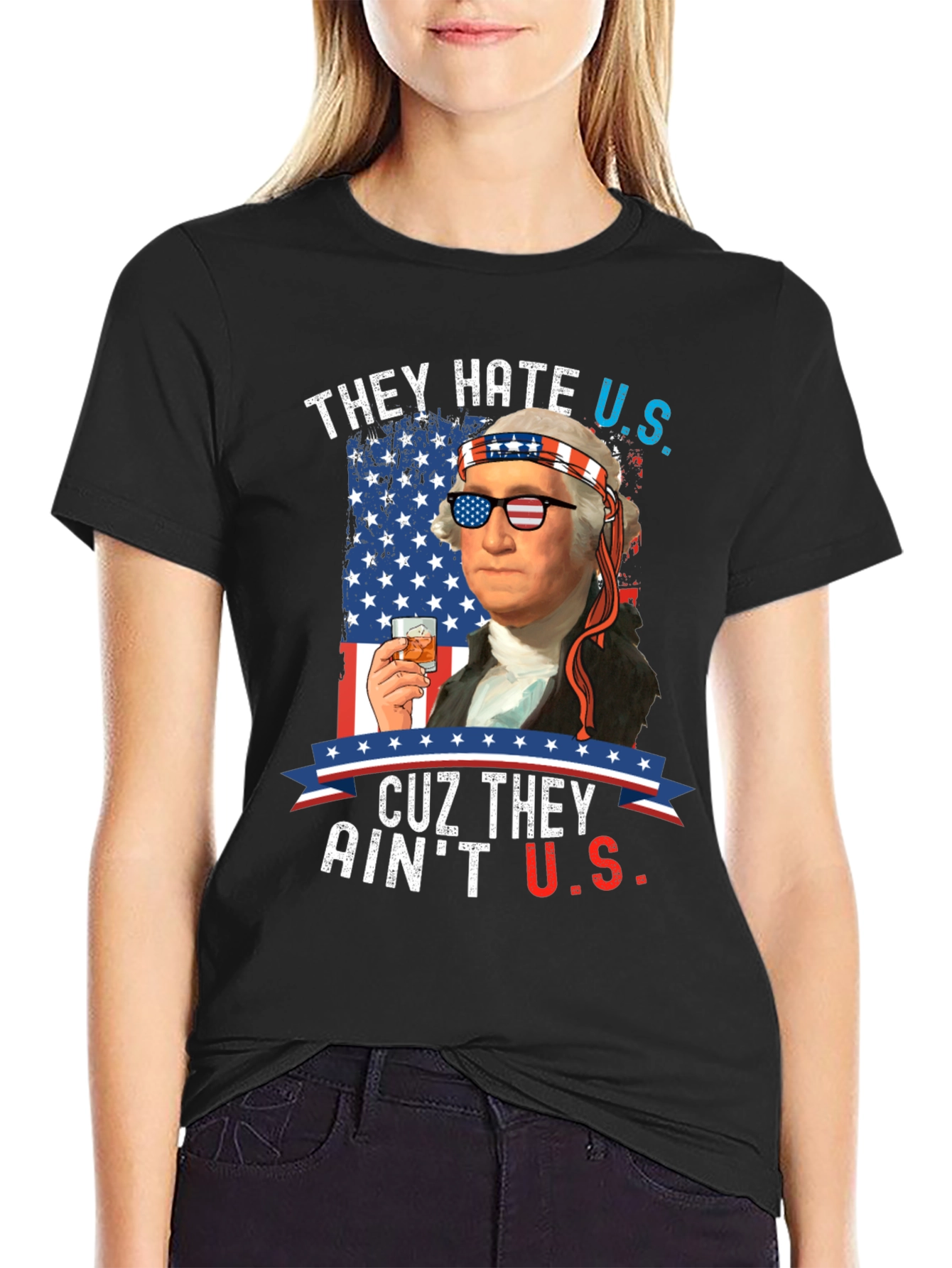 Show off your American pride with this unique black graphic tee. The shirt features an image of George Washington wearing American flag sunglasses and a matching headband, holding a glass, set against a faded American flag backdrop. The bold text proclaims "They Hate U.S. CUZ THEY AIN'T U.S.", adding a touch of humor. Perfect for 4th of July celebrations, political rallies, or casual wear. Made from comfortable materials, this t-shirt is a must-have for anyone who loves America. Makes a great gift!