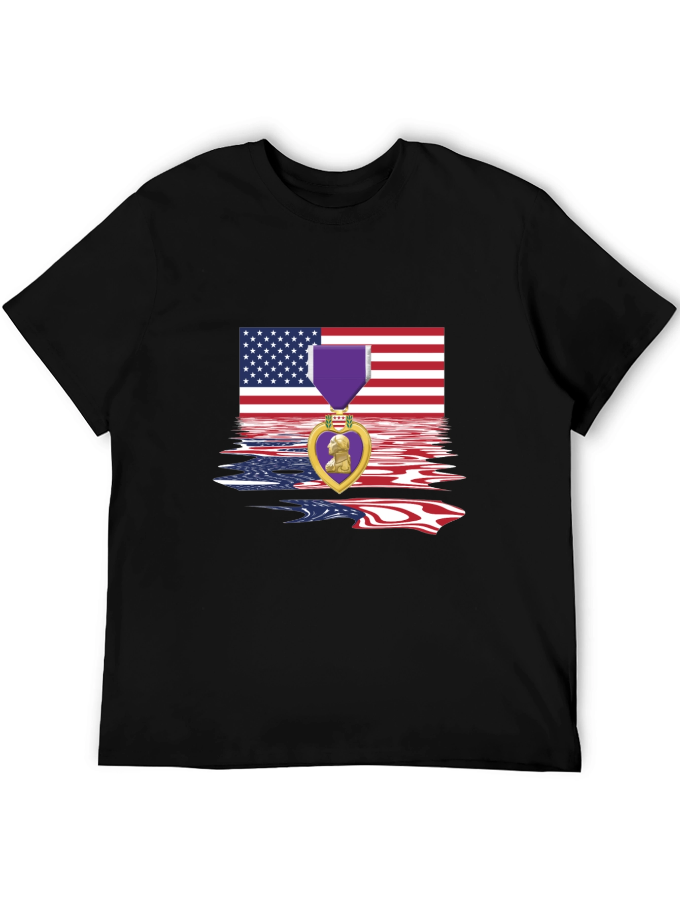 Show your American pride with this striking black t-shirt! Featuring a vibrant design of the American flag with a unique watery reflection effect, this tee prominently displays the Purple Heart medal. Ideal for veterans, military families, or anyone who wants to honor service and sacrifice. The shirt is made from a comfortable fabric, perfect for casual wear or patriotic events. A bold statement piece that combines national pride with respect for military service, this tee is a must-have for anyone looking to express their support.