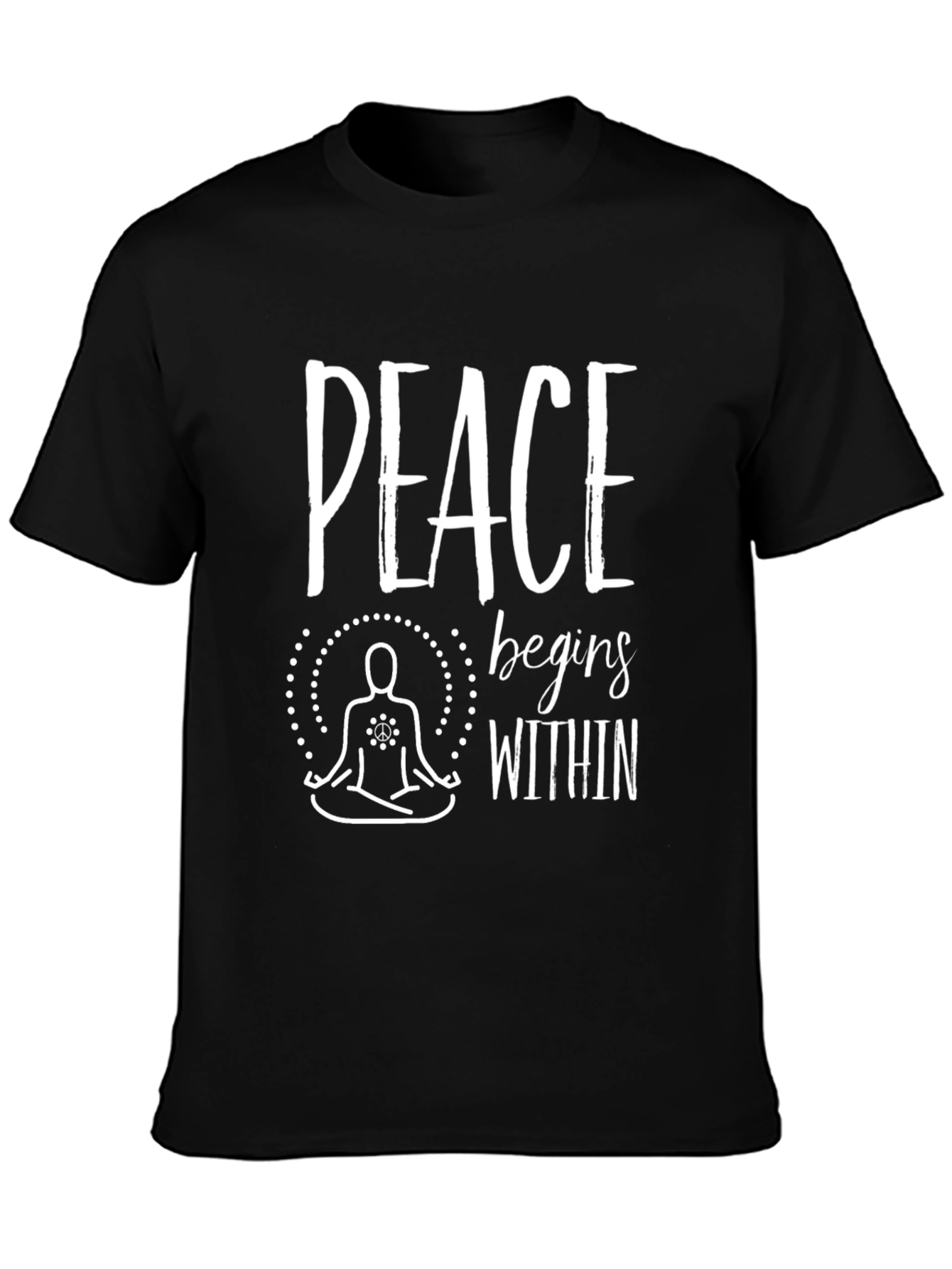 Find your inner peace with this comfortable black t-shirt. This stylish shirt features a crisp white graphic design, showcasing the words "PEACE begins WITHIN" alongside a meditating figure. The serene design promotes mindfulness and tranquility. Made from a soft, breathable fabric, this tee offers all-day comfort. Perfect for yoga sessions, casual outings, or simply relaxing at home. Embrace positivity and style with this unique and meaningful t-shirt. A great addition to any wardrobe!