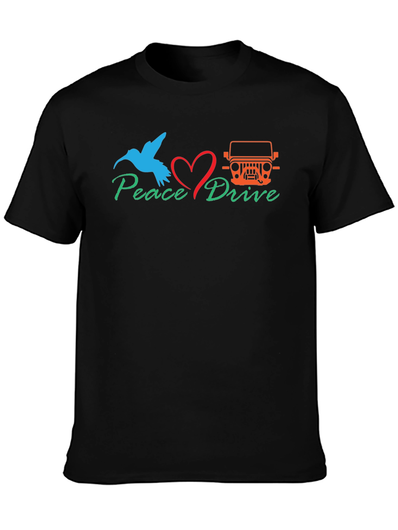 Show your love for peace and driving with this unique graphic t-shirt. Featuring a vibrant design, this black tee showcases a blue bird, a red heart, and an orange Jeep. The words "Peace Drive" are displayed in green, adding a touch of nature-inspired charm. Perfect for casual outings, road trips, or simply expressing your positive vibes, this comfortable shirt is a stylish way to make a statement. Made from a soft and breathable fabric, this tee ensures all-day comfort. Get yours today and spread the message of peace and adventure wherever you go!