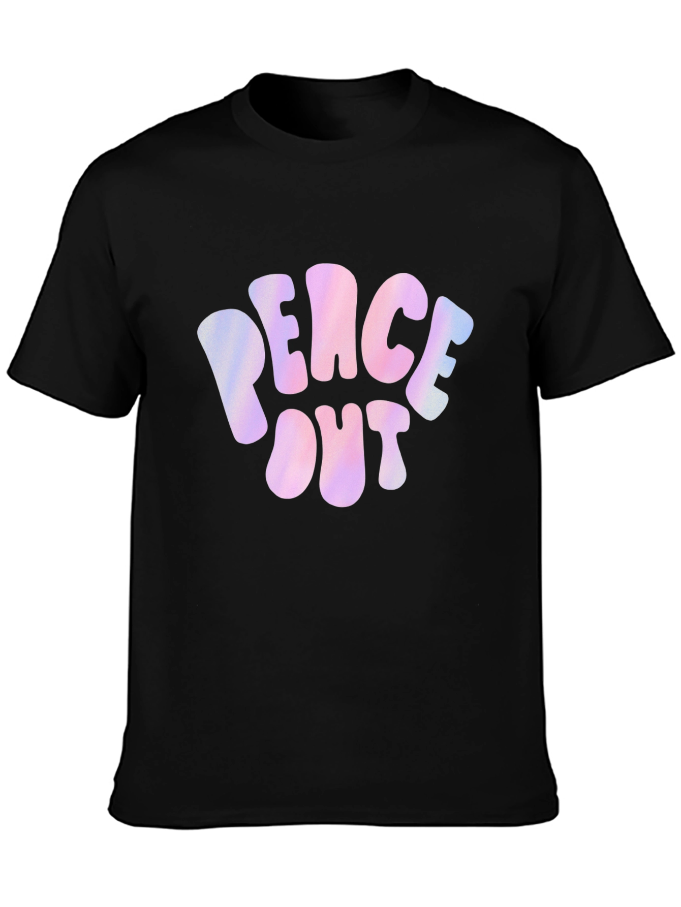 Embrace retro vibes with this stylish black t-shirt featuring a groovy "Peace Out" graphic. The design boasts a playful, rounded font with a holographic effect in shades of pink, purple, and blue, giving it a unique and eye-catching look. Crafted from a comfortable, soft-feel fabric, this tee is perfect for everyday wear. Pair it with jeans for a casual outing, or dress it up with a skirt for a fun, eclectic style. Whether you're heading to a music festival or simply hanging out with friends, this t-shirt is sure to make a statement and spread good vibes. It's a versatile piece that easily complements any wardrobe.