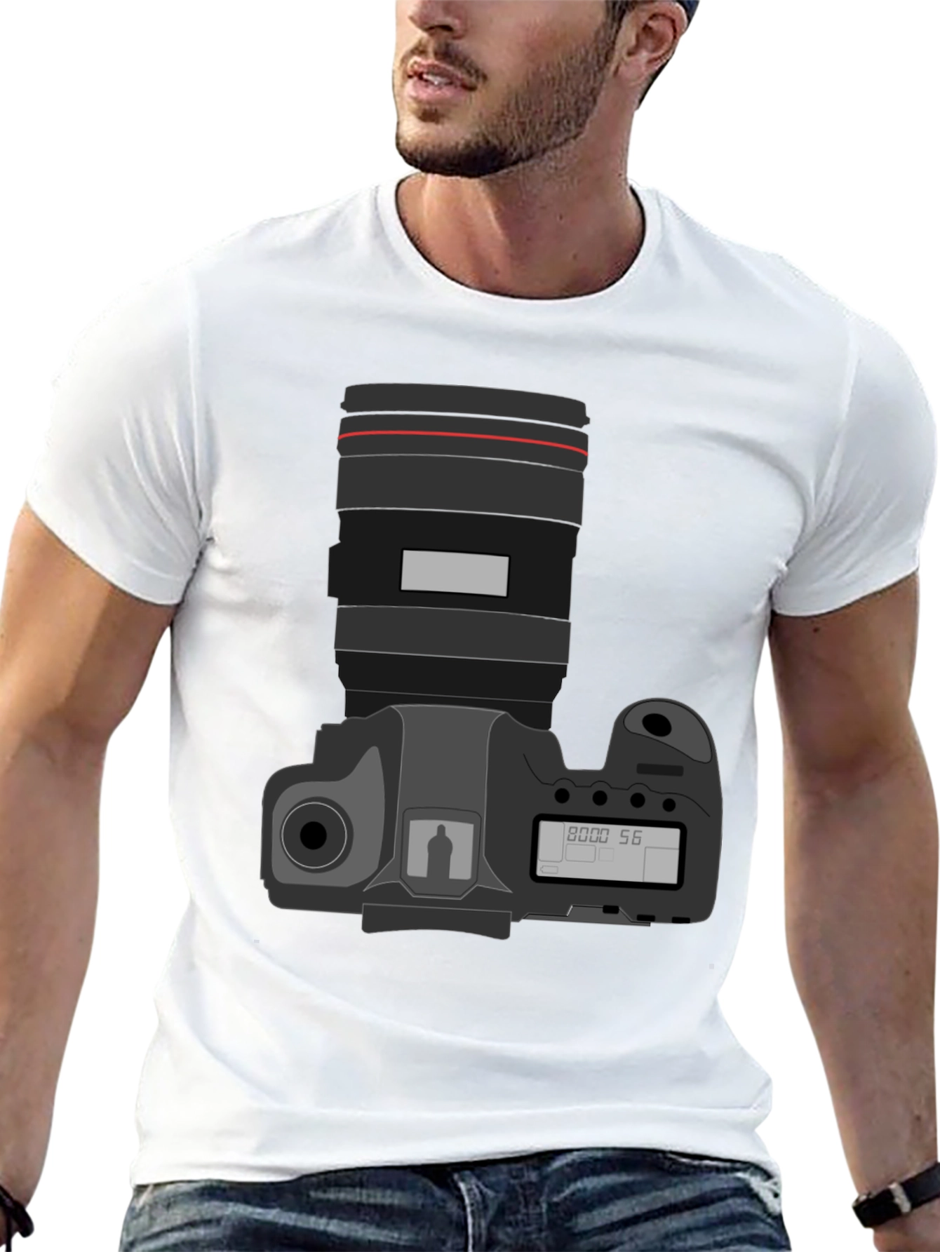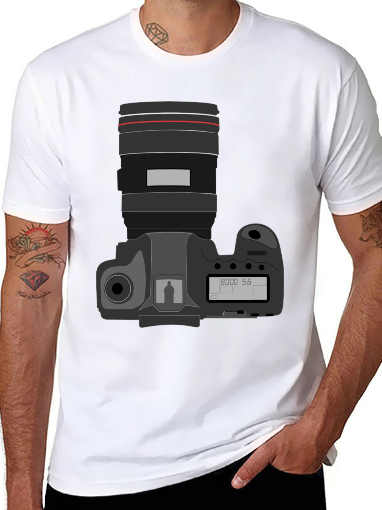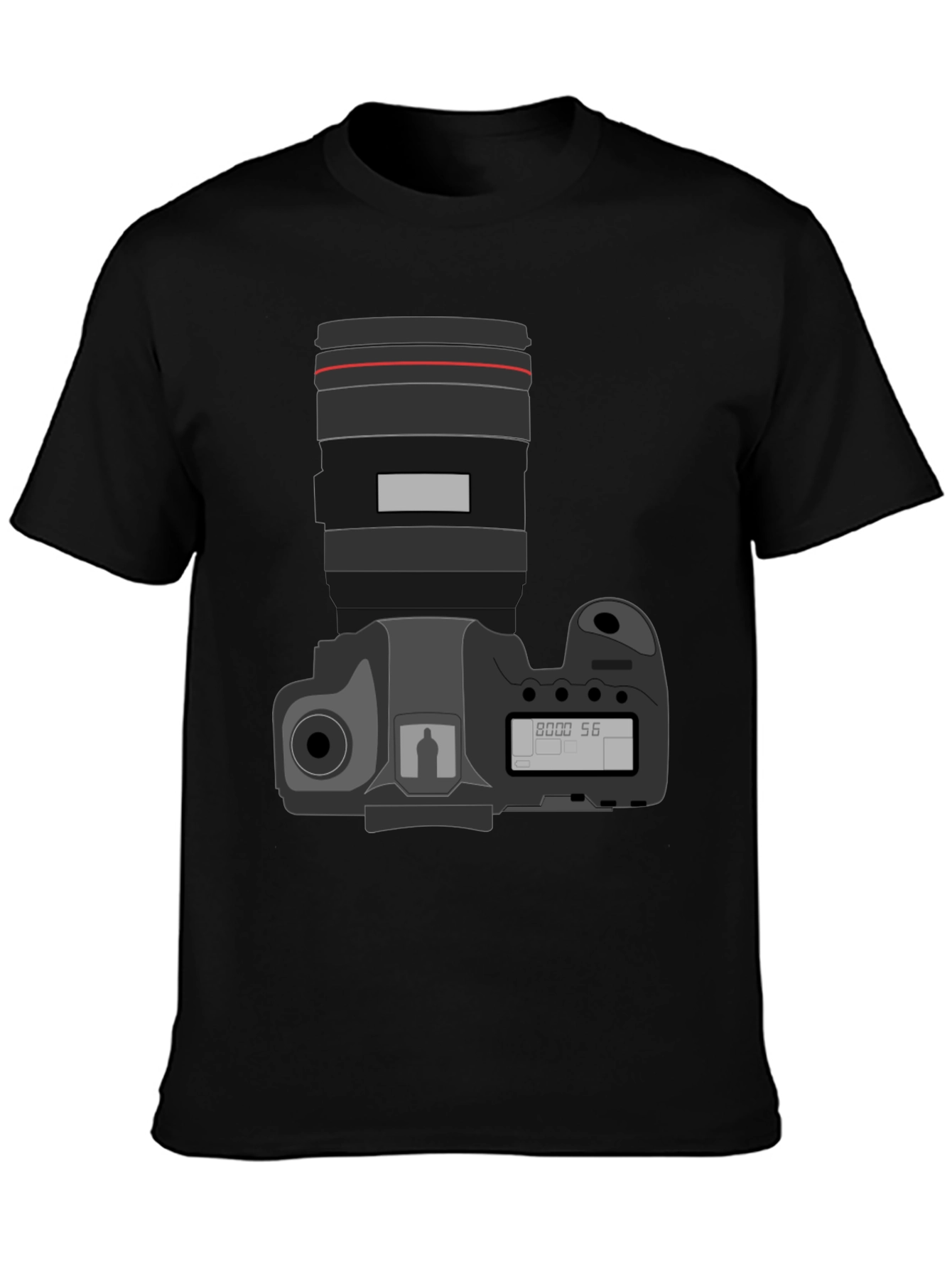 Capture attention with this unique black t-shirt featuring a detailed graphic of a DSLR camera. This eye-catching design is perfect for photography enthusiasts, hobbyists, or anyone who appreciates a creative and stylish look. The graphic showcases a top-down view of a professional camera body with a lens attached, making it instantly recognizable to fellow photographers. Made from comfortable, breathable fabric, this shirt is ideal for everyday wear, photography outings, or casual events. The shirt is a conversation starter and a fun way to express your passion for photography. Show off your love for cameras with this distinctive and trendy t-shirt!