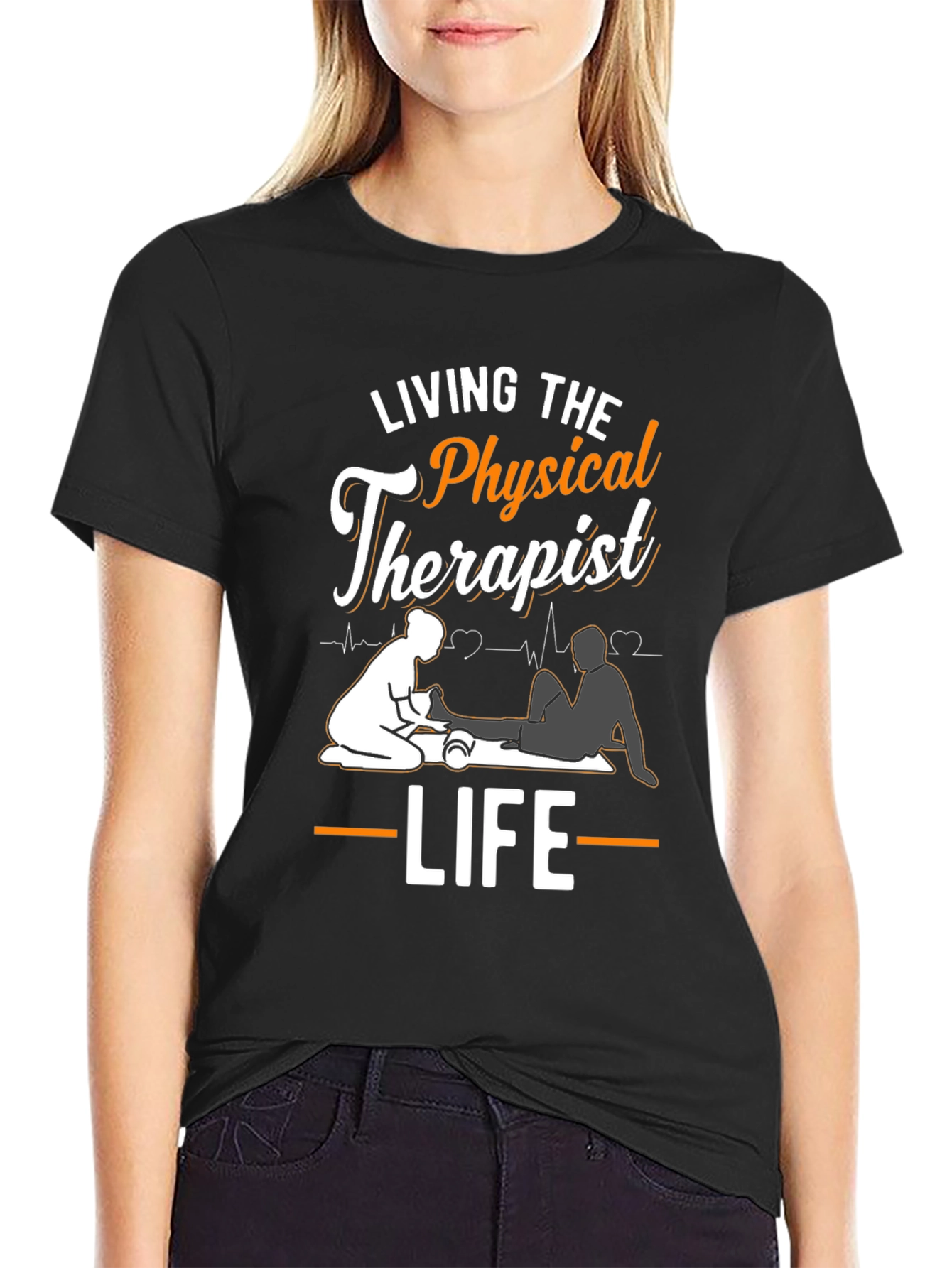 Show your passion for physical therapy with this unique t-shirt! The design features the words "Living The Physical Therapist Life" above an illustration of a therapist treating a patient. This short-sleeved tee is casual, comfortable, and perfect for everyday wear. A great gift for physical therapists, assistants, or students who love their profession. Wear it to work, the gym, or casual outings to spark conversations and spread awareness about the importance of physical therapy. Get yours today!