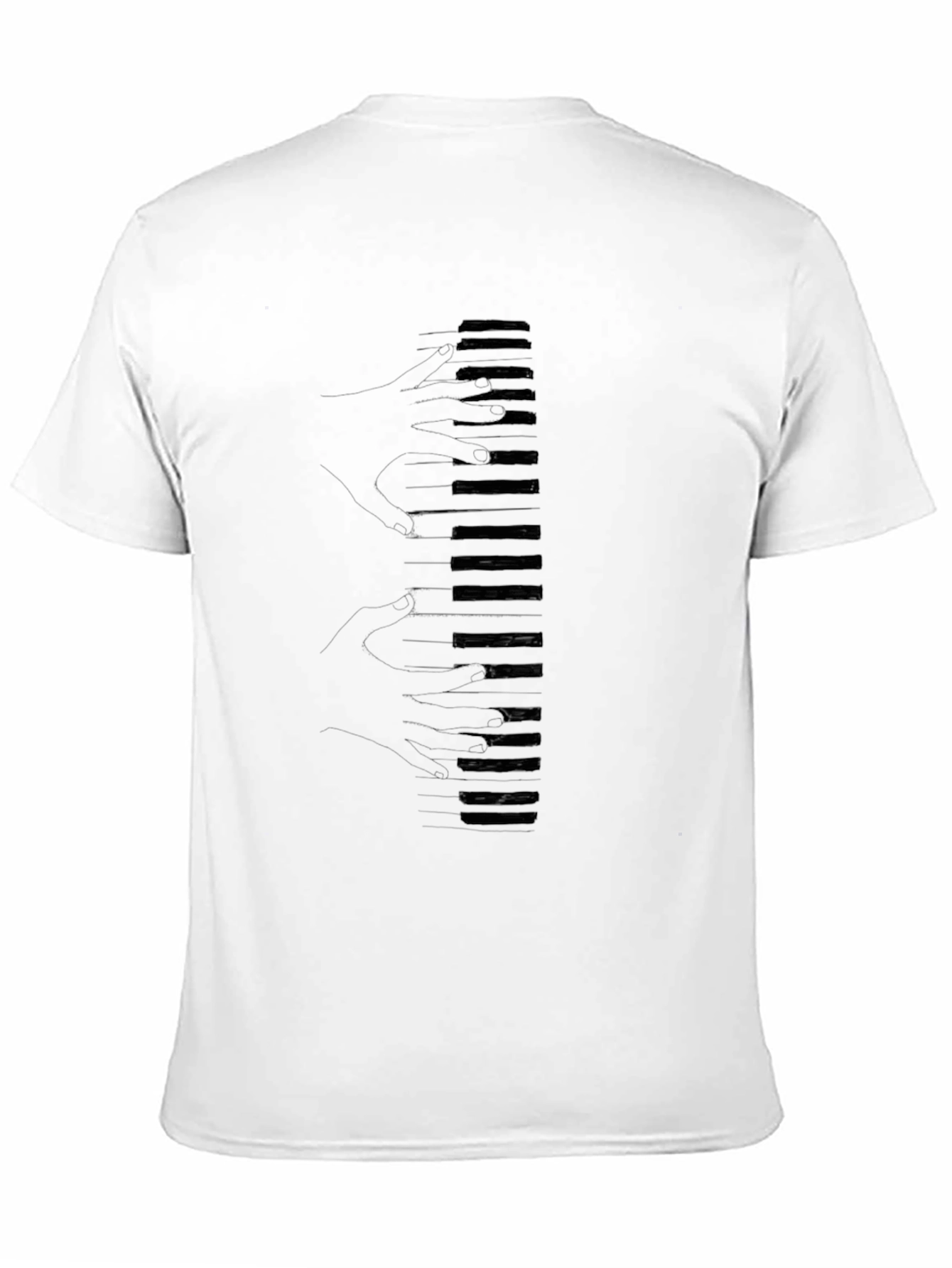 Show off your love for music with this unique black T-shirt! Featuring a creative graphic design of piano keys formed by hands, this tee is sure to catch the eye. Made from a soft, comfortable cotton blend, this shirt is perfect for everyday wear. The design is subtly printed and stylish. Dress it up with jeans or wear it casually with shorts. Ideal for musicians, music lovers, or anyone who appreciates a cool graphic tee, it also makes a great gift. Order now and add this standout piece to your wardrobe!