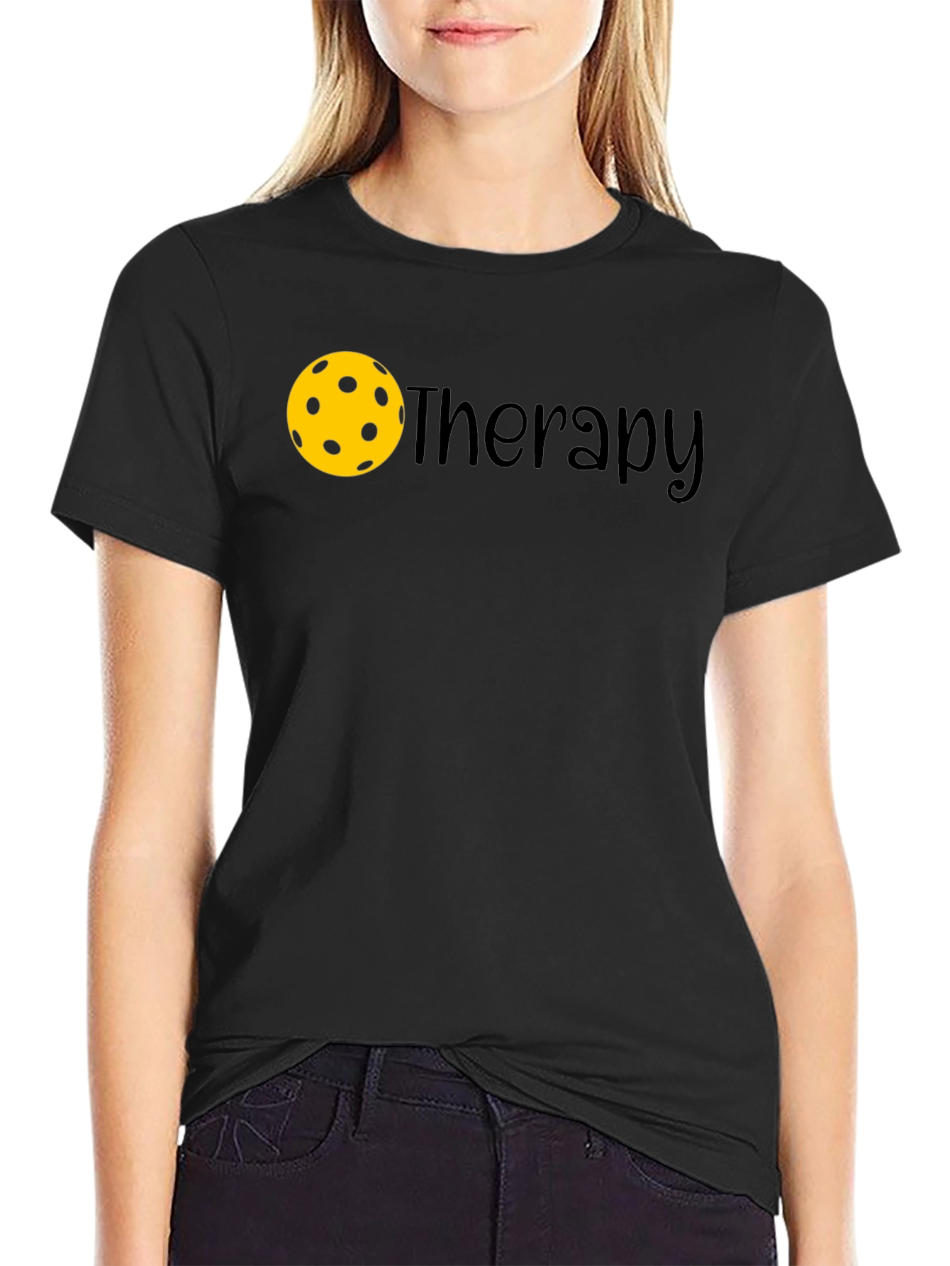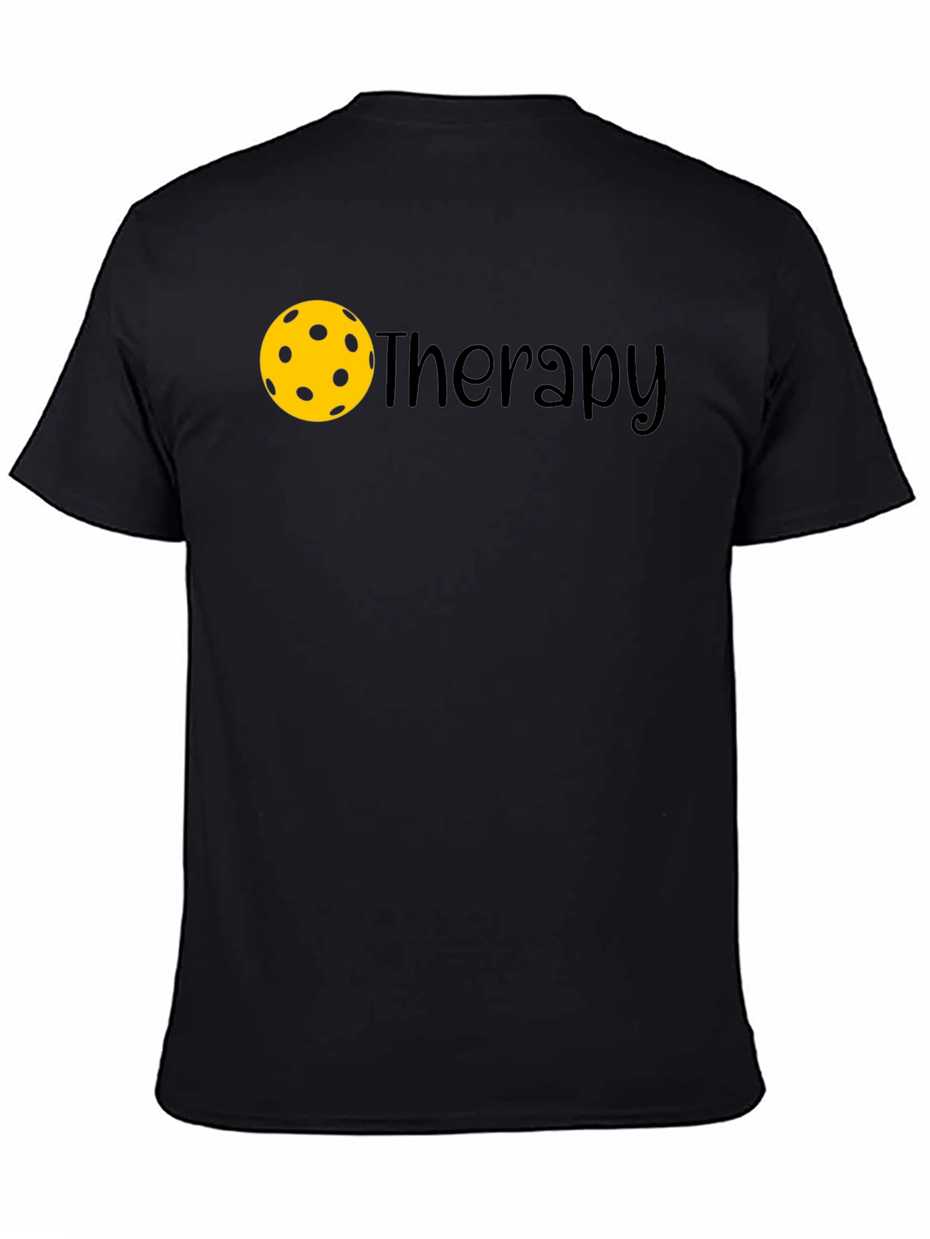 This classic black t-shirt features a playful design: a yellow pickleball with black holes takes the place of the 'O' in the word 'Therapy'. The shirt appears to be made of comfortable, breathable cotton or a cotton blend. It's a stylish and humorous way for pickleball enthusiasts to show their love for the game and the therapeutic benefits they derive from it. Perfect for casual wear, pickleball tournaments, or a fun day on the courts, this shirt is sure to spark conversations and smiles. The simple yet eye-catching design makes it a great gift for any pickleball lover or anyone who finds joy and stress relief in sports and exercise.