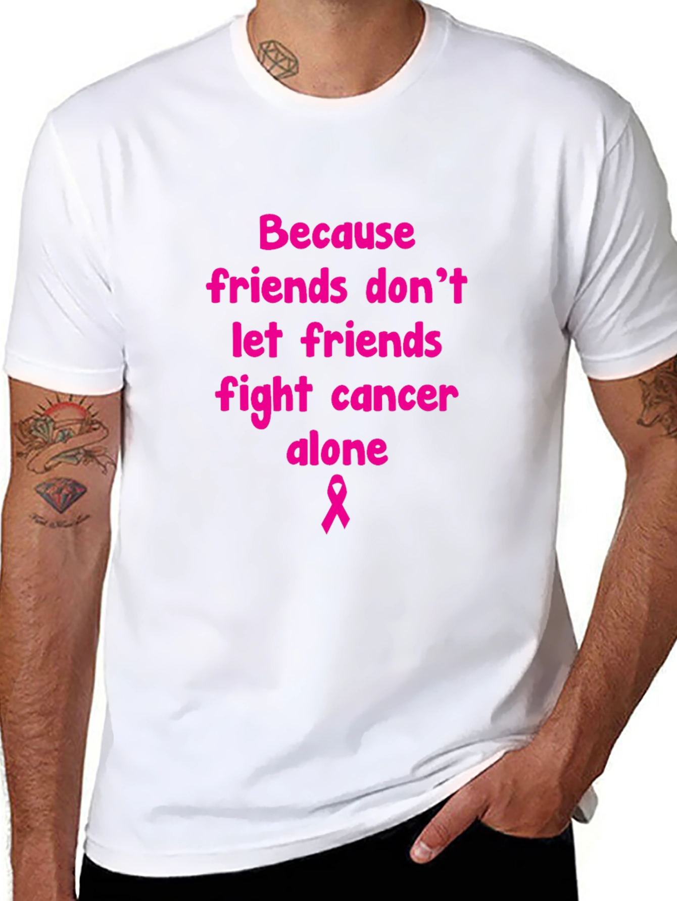 Show your support with this classic black t-shirt featuring a powerful message. Bold pink text proclaims, "Because friends don't let friends fight cancer alone," accompanied by a pink ribbon symbol. Made from a comfortable-looking fabric, this tee is perfect for raising awareness and showing solidarity. Ideal for walks, events, or everyday wear. A meaningful and stylish way to support the fight against cancer.