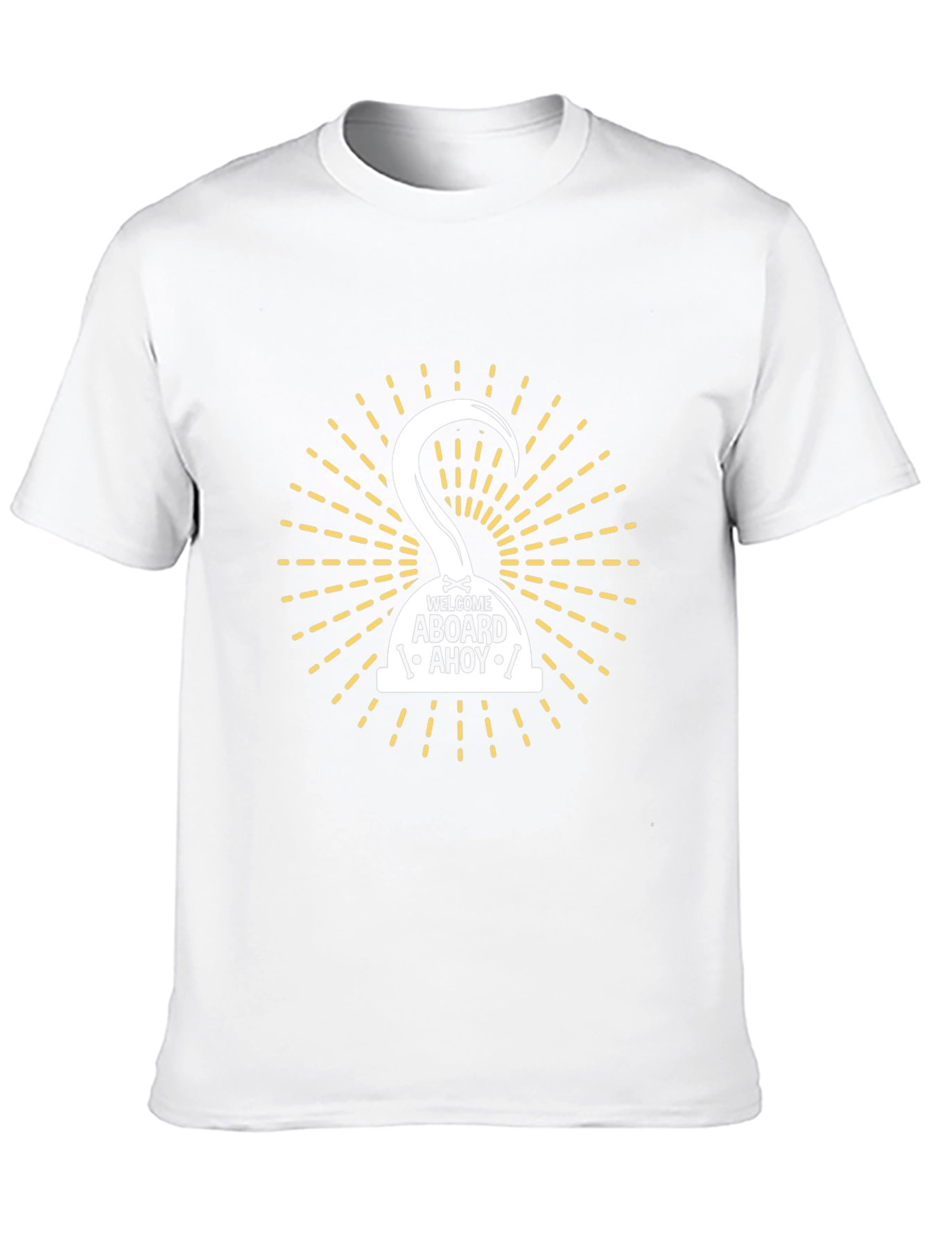 Embrace your inner pirate with this unique graphic tee! The shirt features a stylish pirate hook design, surrounded by radiating lines, creating a captivating focal point. Below the hook, the words "Welcome Aboard Ahoy" add a touch of nautical charm. This black t-shirt is perfect for casual outings, themed parties, or adding a touch of adventure to your everyday wardrobe. Made from soft, breathable fabric, this tee ensures all-day comfort. Stand out from the crowd and let your adventurous spirit shine with this eye-catching tee. Get yours today and set sail on a fashion adventure!
