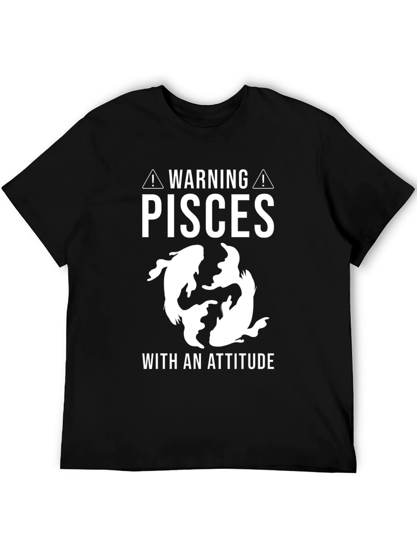 Show off your zodiac sign with this bold, black t-shirt! Featuring a white graphic design with "WARNING PISCES" printed above an artistic representation of two fish, and "WITH AN ATTITUDE" printed below, this shirt perfectly embodies the feisty spirit of a Pisces. Made from soft and comfortable fabric, this tee is perfect for everyday wear, casual outings, or as a fun conversation starter. A great addition to your wardrobe or a gift for the sassy Pisces in your life!
