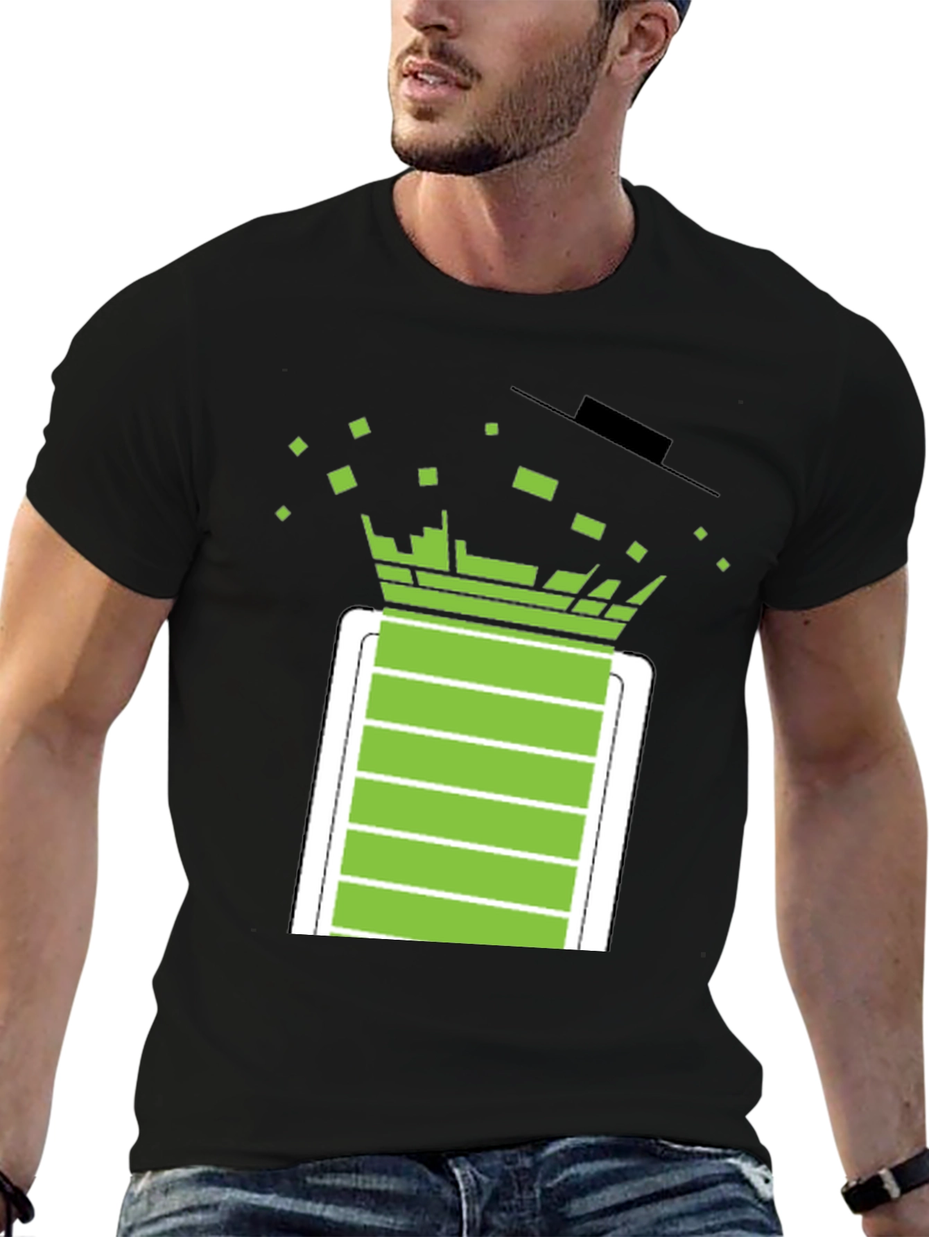 Show off your tech-savvy style with this eye-catching black t-shirt. This unique tee features a cool, pixelated graphic of a charging battery, making it a standout piece in any wardrobe. The green and white battery design pops against the black background, ensuring you'll turn heads wherever you go. Crafted from a comfortable material, this shirt is perfect for everyday wear, casual outings, or tech-themed events. Upgrade your t-shirt game and express your personality with this must-have addition to your collection.