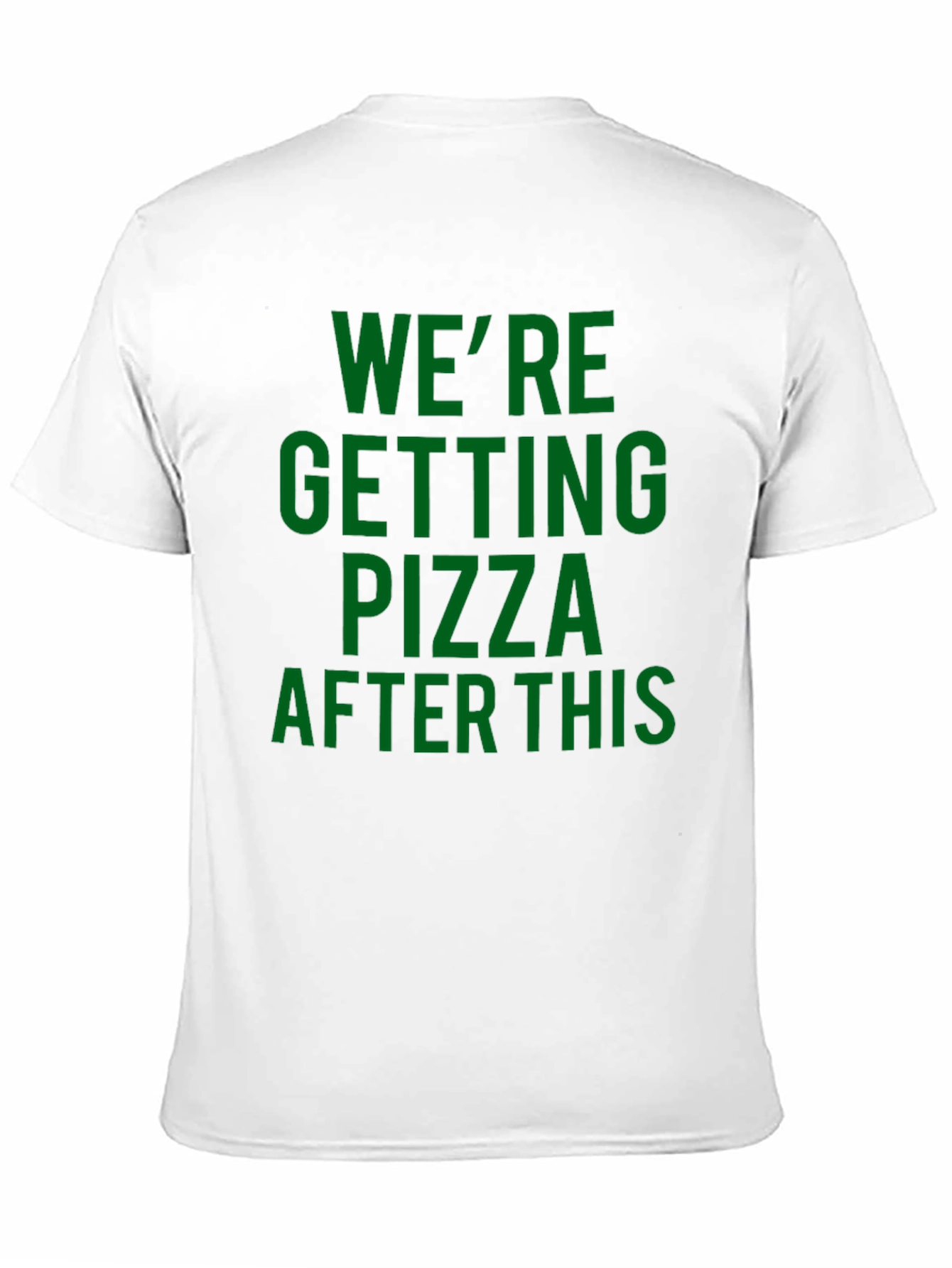 Show off your love for pizza with this stylish black t-shirt. The shirt features a bold, green text design that reads "WE'RE GETTING PIZZA AFTER THIS". Made from soft, breathable fabric, this tee is perfect for casual wear. Its classic fit ensures comfort and versatility for any occasion. Whether you're heading to a pizza party, a casual get-together, or simply lounging at home, this t-shirt is a fun way to express your enthusiasm for everyone's favorite food. This tee is sure to be a hit with pizza lovers of all ages! Add a playful touch to your wardrobe with this must-have pizza t-shirt.