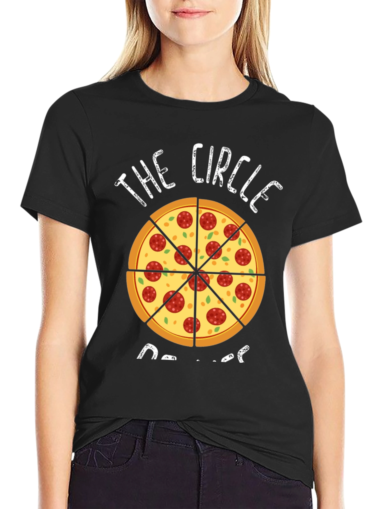 This unique black graphic tee features a vibrant and playful pizza design. The print displays a pizza divided into slices, accompanied by the phrase "The Circle of Trust", making it a fun conversation starter. Made from what appears to be comfortable cotton, this tee is perfect for casual wear. The design is bold and eye-catching, ideal for pizza lovers and those with a sense of humor. Wear it to pizza night with friends, casual outings, or lounging at home. This tee offers a blend of comfort, style, and a touch of foodie fun.