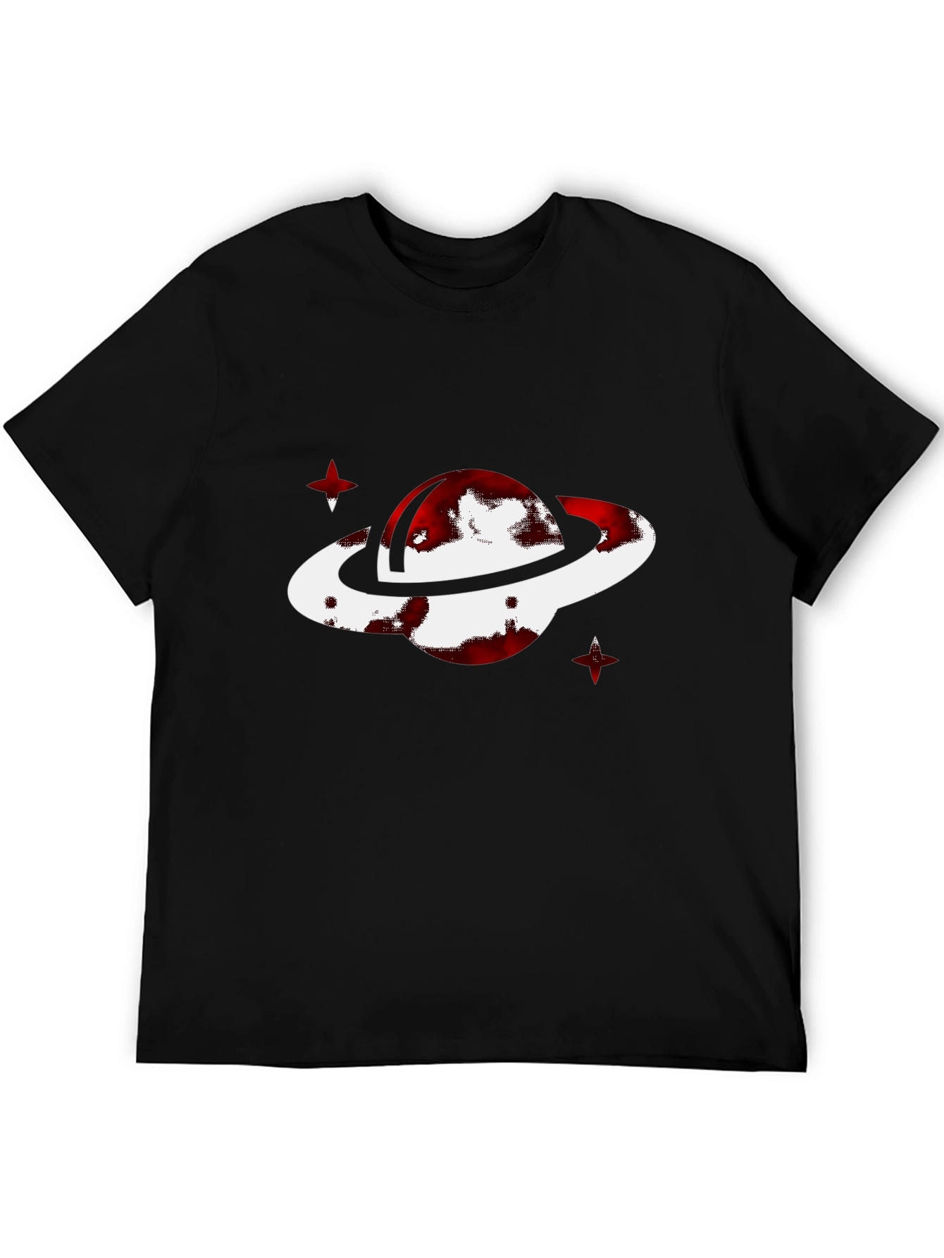 Show off your unique style with this eye-catching black t-shirt. The shirt features a cool planet graphic design with a white and red planet and two red stars. Made from a soft, comfortable fabric, this t-shirt is perfect for everyday wear. The shirt is a classic fit and is sure to become a wardrobe favorite. Pair it with jeans or shorts for a casual look, or dress it up with a jacket for a night out. Make a statement with this cool graphic tee!