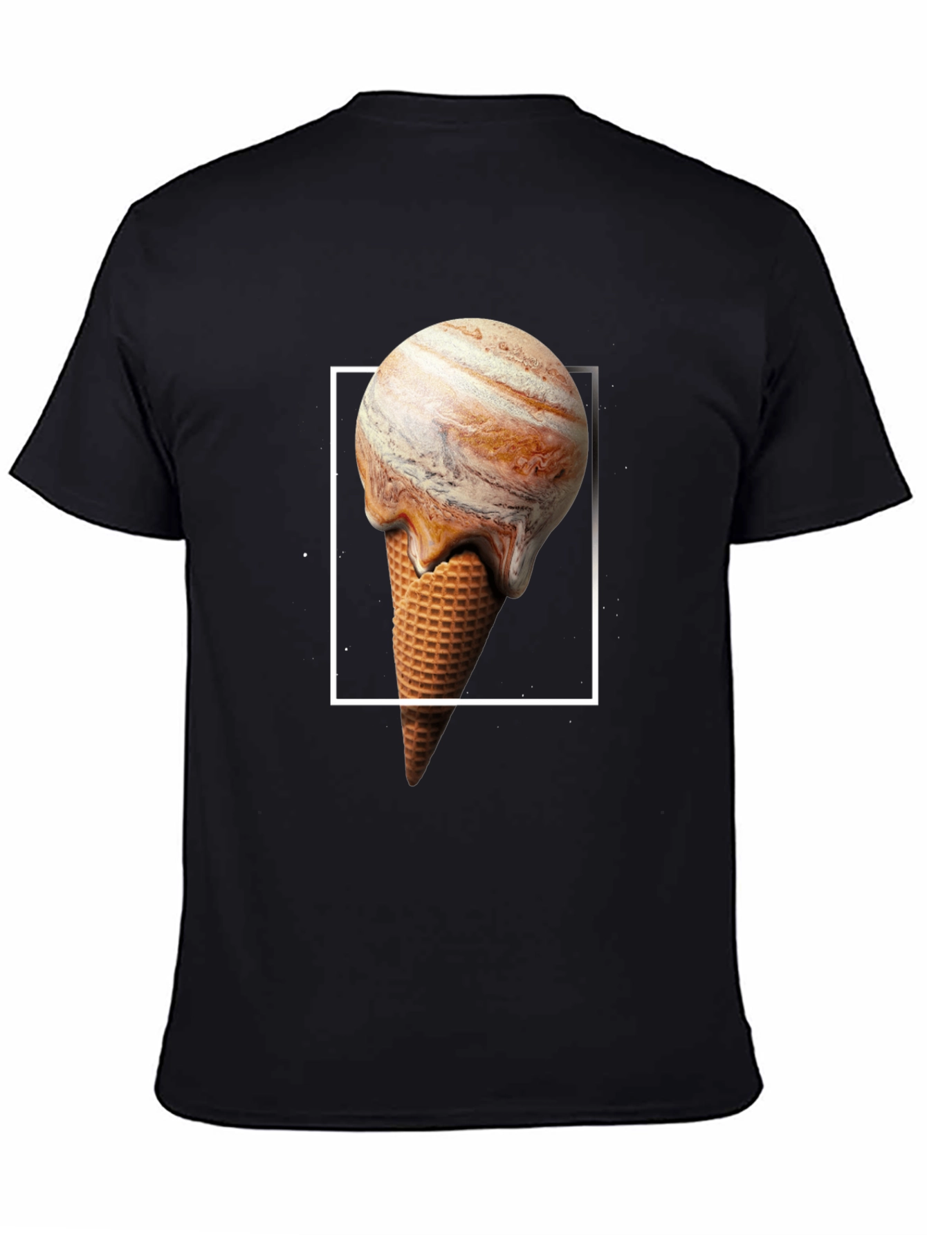 This unique t-shirt features a creative design that blends the celestial with the sweet. The graphic showcases a photorealistic rendering of planet Jupiter as a melting ice cream cone. The shirt appears to be made from a comfortable, soft black cotton blend. The design is framed by a square. This novelty tee is perfect for astronomy lovers, ice cream enthusiasts, or anyone who enjoys quirky and eye-catching apparel. Wear it casually or use it as a conversation starter at your next social gathering. It's a fun way to add a touch of whimsy to your wardrobe.
