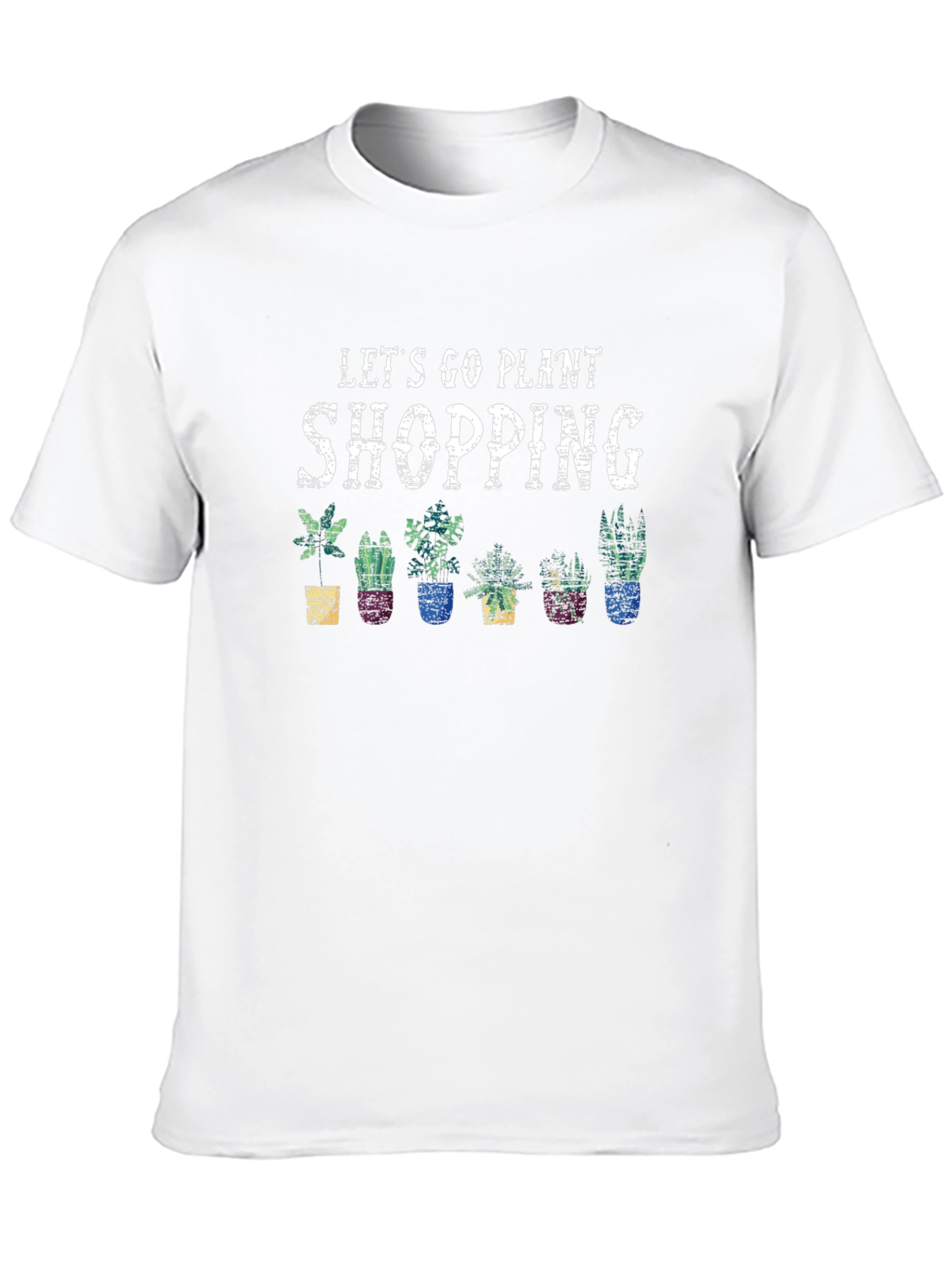 Show off your love for plants with this eye-catching black T-shirt! The shirt features a playful "Let's Go Plant Shopping" slogan in a distressed white font, topped with a vibrant row of potted succulents and cacti. Perfect for plant lovers, gardeners, and anyone who enjoys a touch of nature in their wardrobe. Made from a comfortable-looking fabric, this tee is ideal for casual wear, gardening days, or trips to your favorite nursery. Grab this fun and unique design today and let everyone know you're ready for some plant shopping!