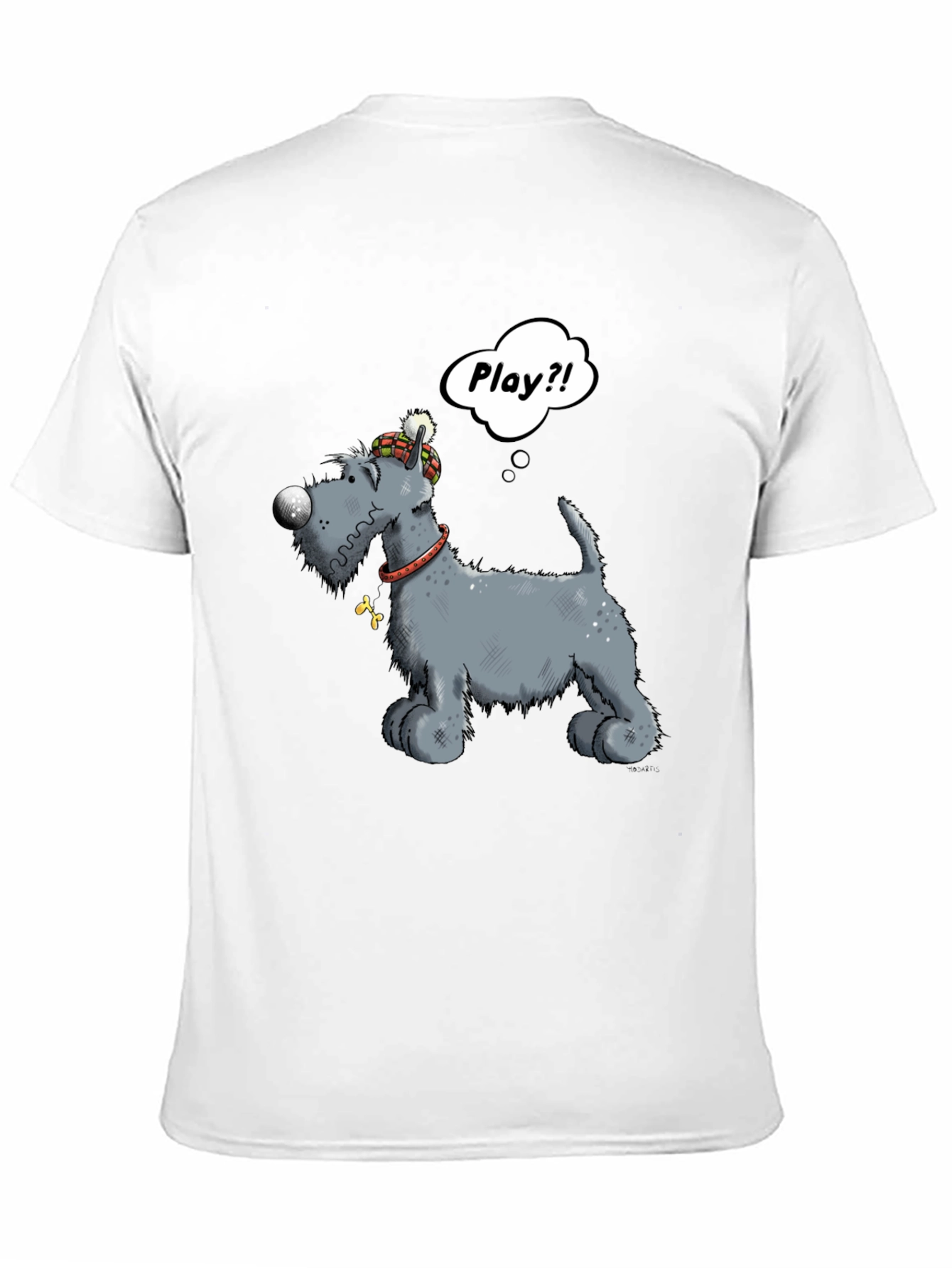 Show off your love for dogs with this playful graphic tee. Featuring a cartoon illustration of a terrier with a quirky hat and "Play?!" thought bubble, this shirt is sure to turn heads. The design is printed on a soft, comfortable black tee, perfect for everyday wear. This t-shirt is a fun way to add personality to your wardrobe. Pair it with jeans or shorts for a casual look. Ideal for dog lovers and anyone with a sense of humor. Get yours today and let the fun begin!