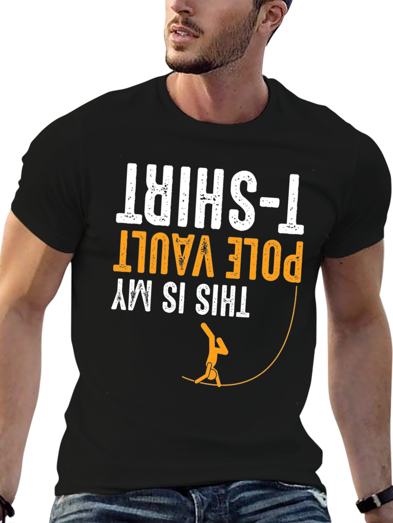 Showcase your passion for pole vaulting with this stylish black T-shirt! This comfortable tee features a unique design with the words "THIS IS MY POLE VAULT T-SHIRT" printed in bold, eye-catching colors. An artistic graphic of a pole vaulter in action adds an extra touch of personality. Made from soft, breathable fabric, this shirt is perfect for casual wear, workouts, or cheering on your favorite pole vaulter at a competition. A must-have addition to any pole vault enthusiast's wardrobe. Get yours today and let your love for the sport shine!