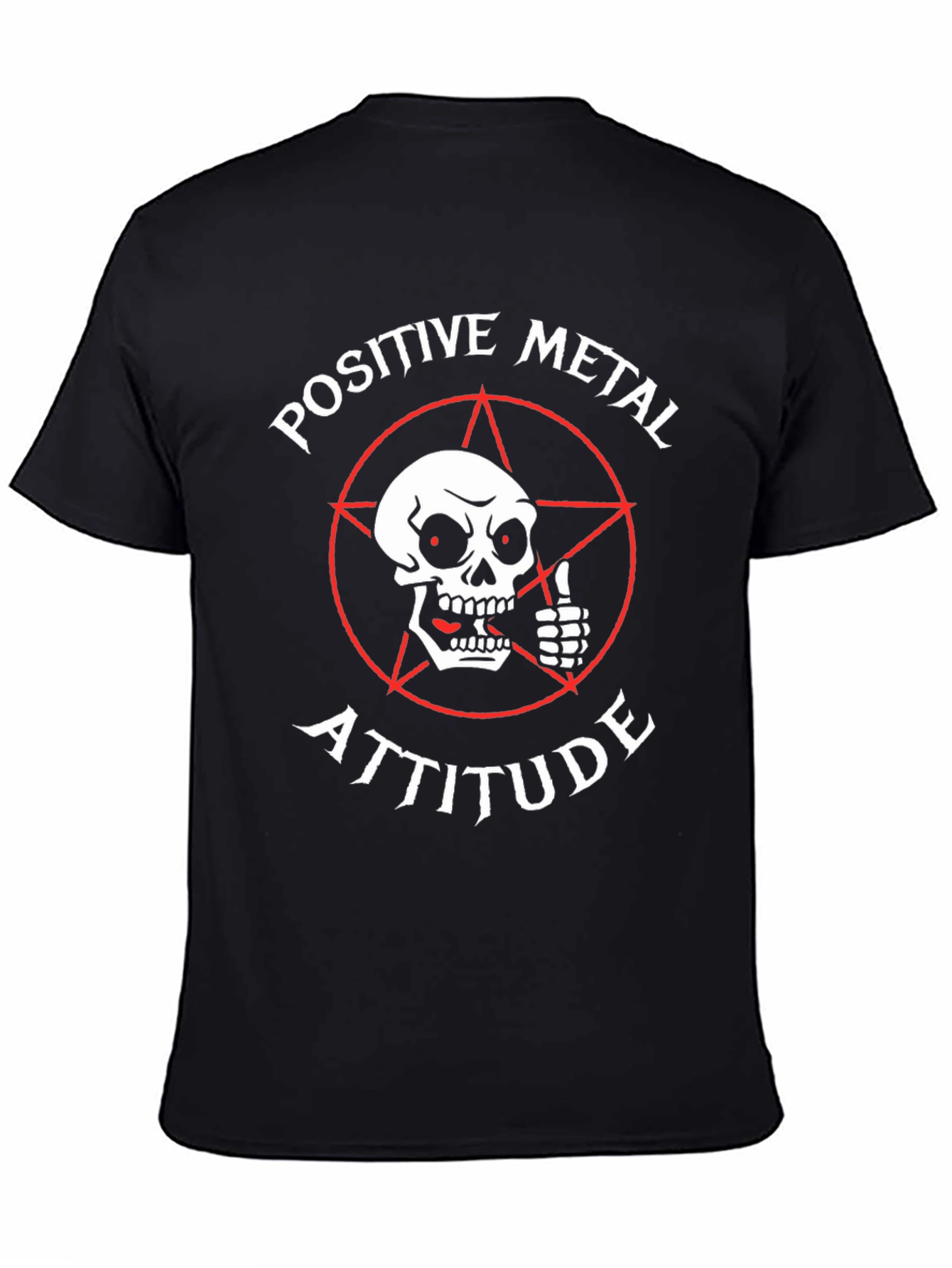 Show your love for metal with this unique and eye-catching t-shirt. The shirt features a skull giving a thumbs-up inside a pentagram with the words "Positive Metal Attitude" printed above and below the graphic. It's a bold statement that is sure to grab attention. Made from a comfortable-looking black fabric, this tee is perfect for concerts, casual outings, or expressing your individuality. Get yours today and spread the positive metal vibes!