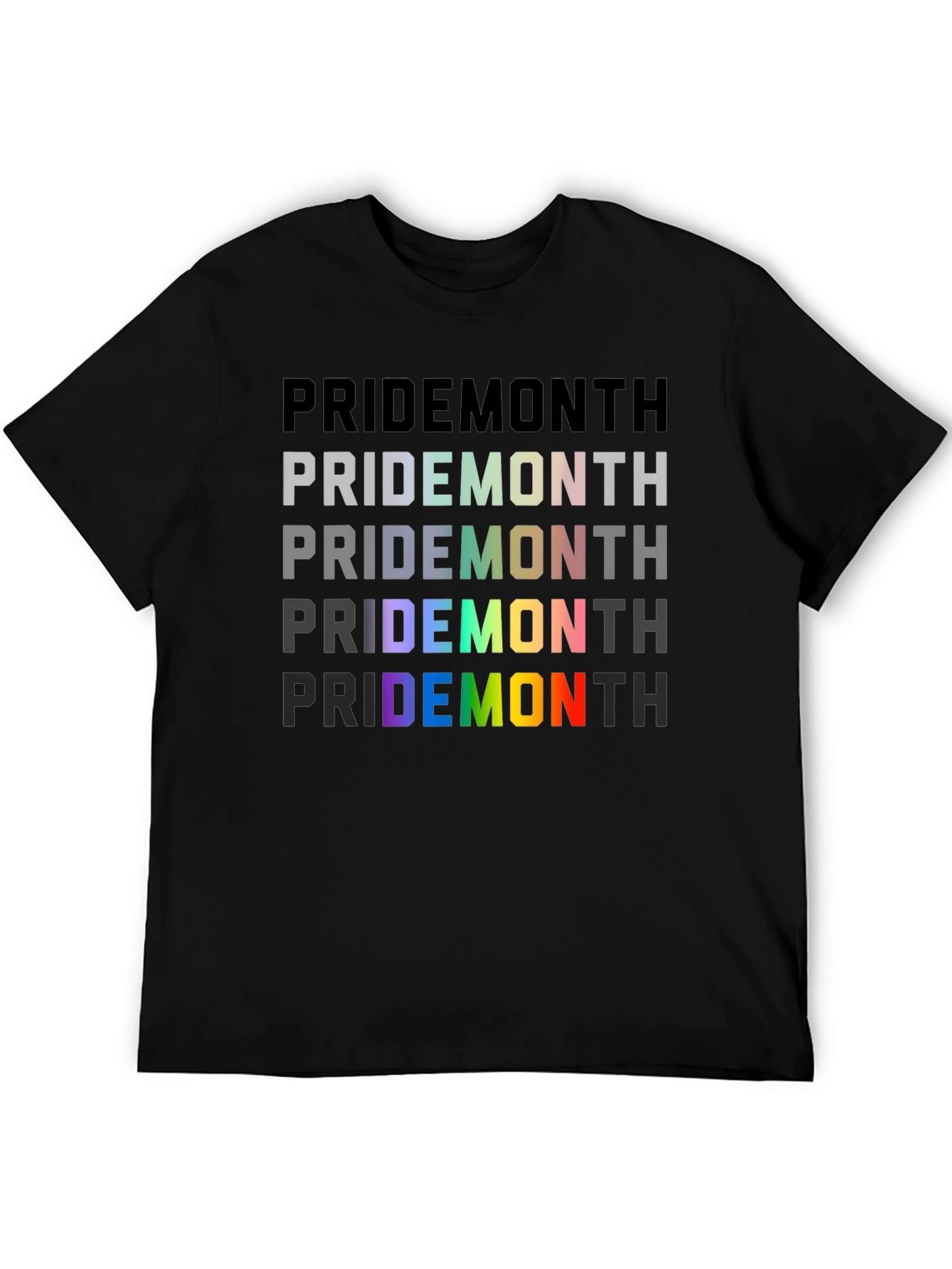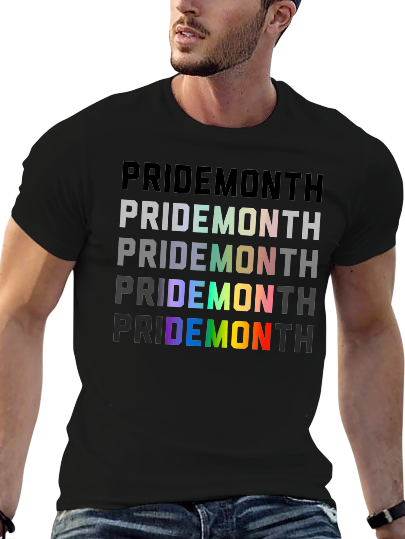 Show your support with this bold Pride Month T-shirt. The black tee features a statement "PRIDEMONTH" graphic repeated in fading grayscale shades, culminating in a vibrant rainbow print. The classic crew neck and comfortable fit make it perfect for everyday wear, pride parades, or casual outings. Let this shirt speak volumes with its powerful message of love and acceptance. Celebrate Pride in style!