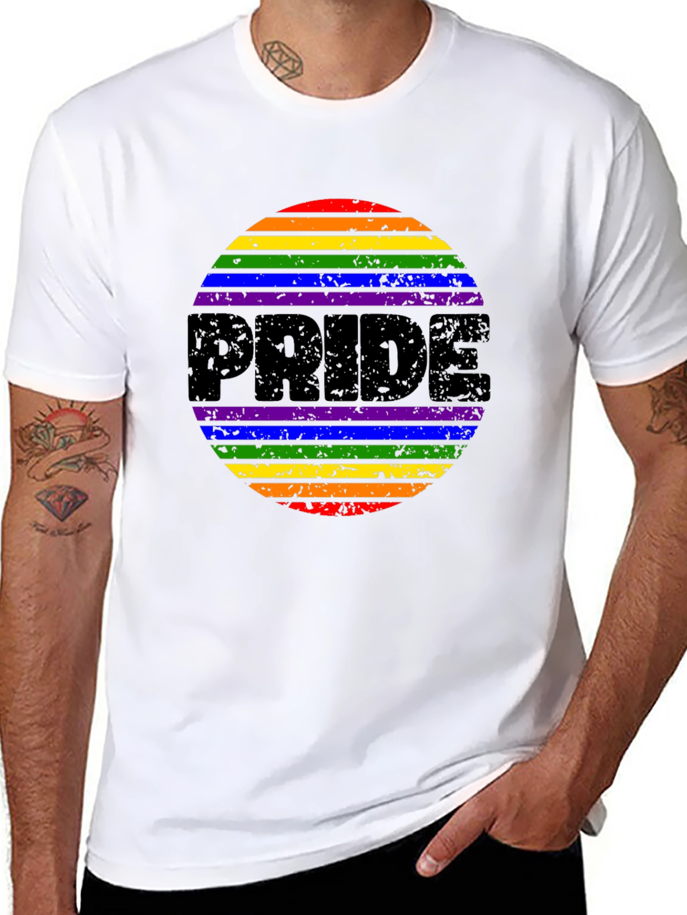 Show your support with this bold Pride rainbow t-shirt! This classic black tee features a vibrant rainbow stripe design in a circle with "PRIDE" written over it, perfect for Pride events, rallies, or everyday wear. Crafted from what appears to be a soft and breathable cotton blend, this unisex shirt offers a comfortable and stylish fit for all. Make a statement and spread love with this eye-catching and meaningful tee. A great addition to your wardrobe and a fantastic way to express solidarity with the LGBTQ+ community. Wear your pride with confidence!