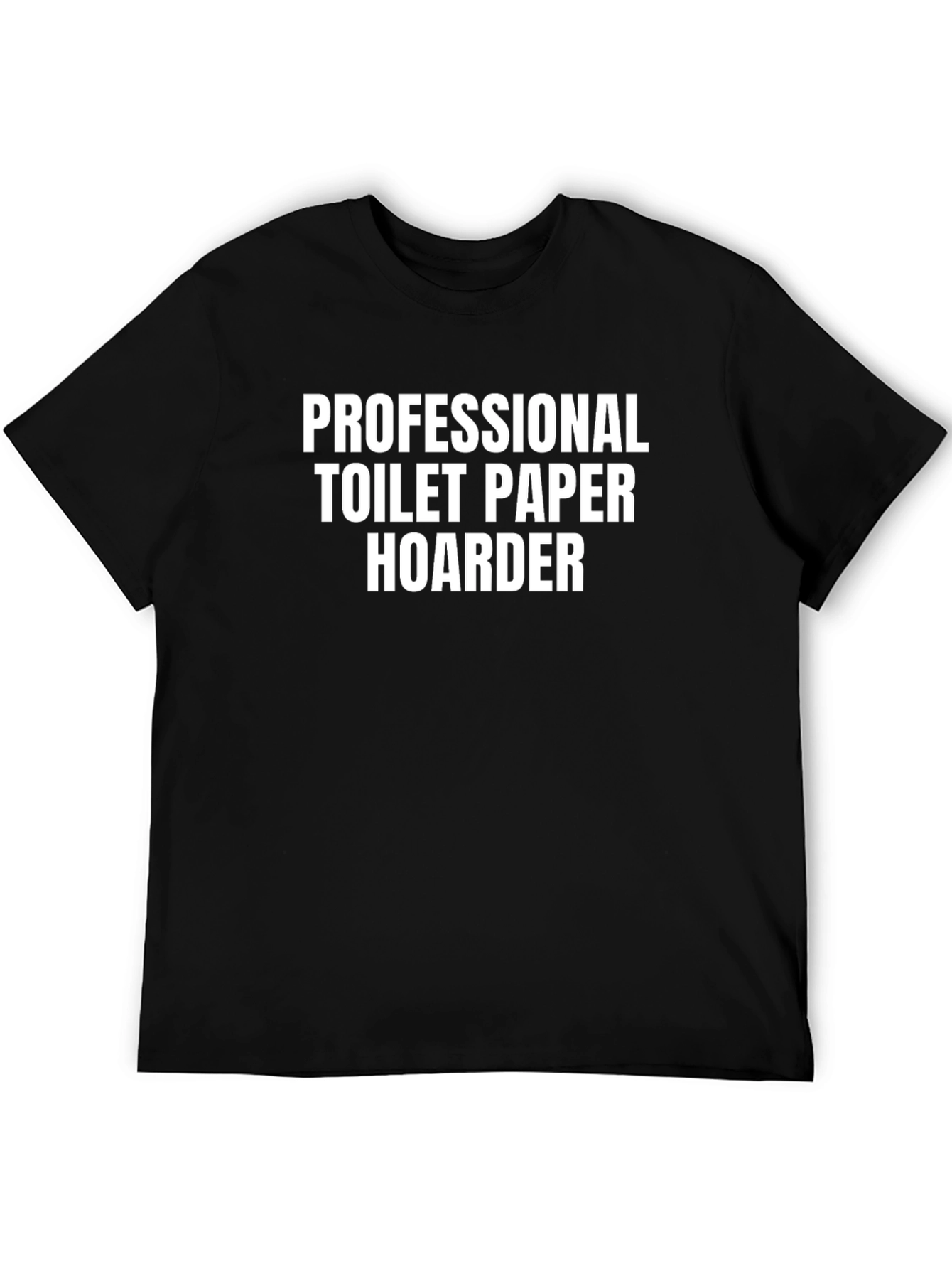 This black t-shirt features bold, white text that reads 'PROFESSIONAL TOILET PAPER HOARDER' in a stacked, attention-grabbing design. Made from what appears to be a comfortable, soft-touch fabric, this tee is perfect for casual wear. The classic crew neck and short sleeves make it a versatile addition to any wardrobe. Wear it to make a statement, spark a conversation, or simply show off your humorous side. This novelty t-shirt is sure to be a hit with anyone who appreciates a good laugh and a comfortable fit. The design is simple yet effective, making it a great gift idea for friends and family with a quirky sense of humor. Show your unique style with this fun and eye-catching tee!