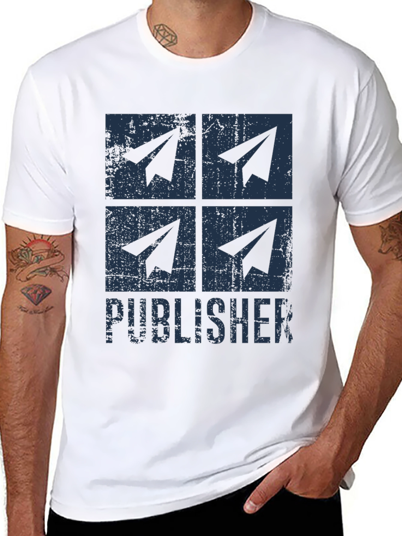 Show off your unique style with this Publisher graphic t-shirt. The shirt features a distressed design with four paper airplane graphics above the word "PUBLISHER." The design has a vintage, worn look, adding character to your wardrobe. Made from comfortable, breathable fabric, this tee is perfect for everyday wear. Pair it with jeans or shorts for a casual look. Whether you're a writer, editor, or simply appreciate the publishing industry, this t-shirt is a great way to express your interests. Available in a classic black color, this tee is a must-have for any stylish individual.