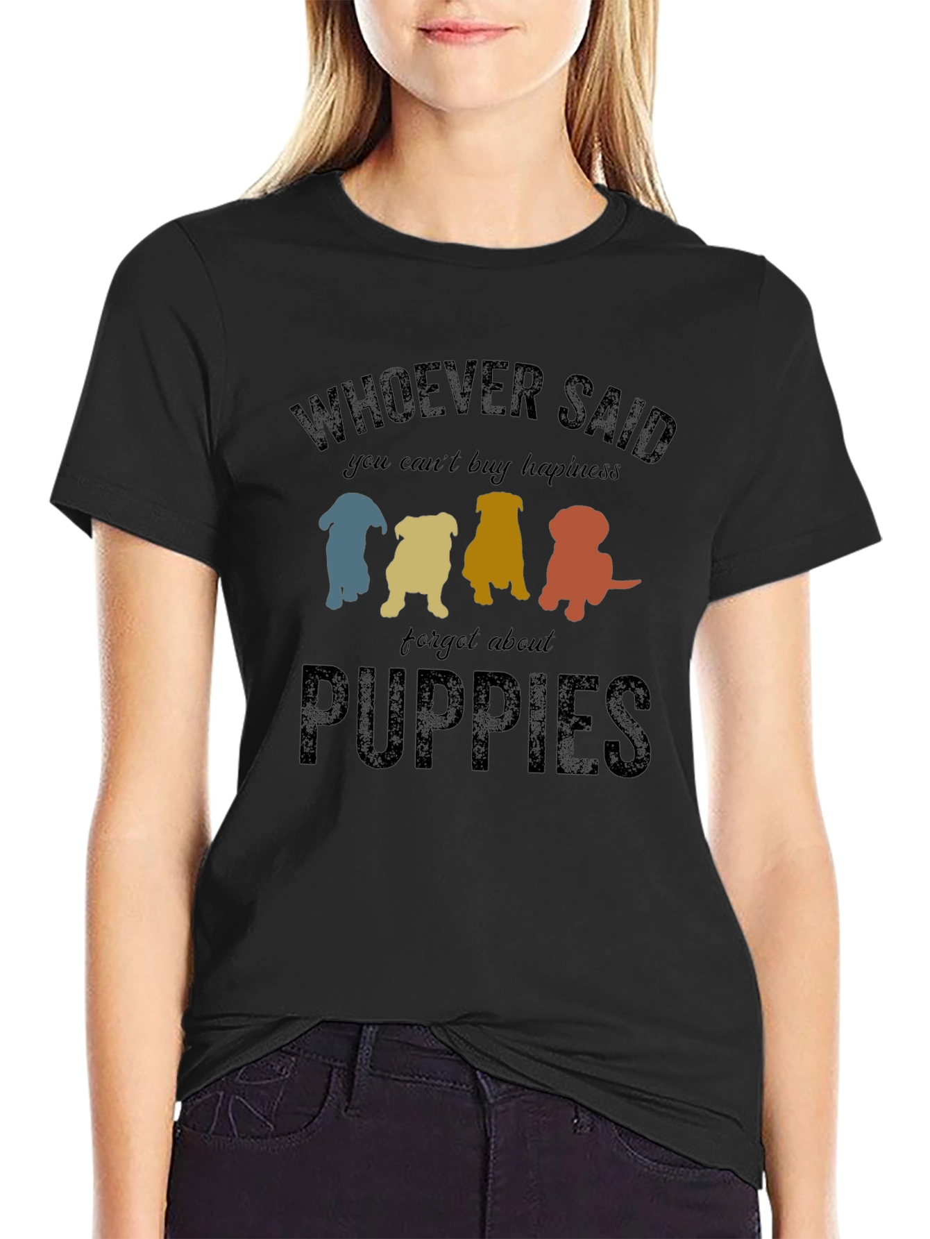 This black t-shirt features a charming graphic design. The shirt's text reads, "Whoever said you can't buy happiness forgot about PUPPIES." Above the word "happiness", you can see four different dog breeds in different colors: blue, tan, yellow, and red. Made from a comfortable-looking material, it is perfect for casual wear and dog lovers. It’s a fun way to express your love for dogs. Ideal for everyday wear, dog walks, or just lounging around at home.