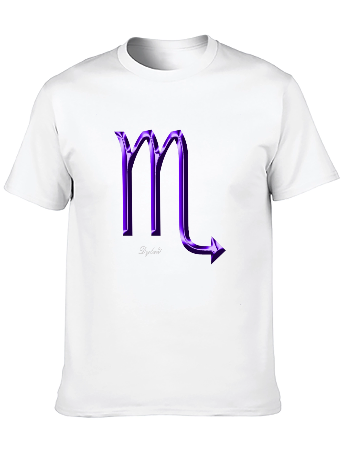 Show off your zodiac sign with this stylish black t-shirt. The shirt features a vibrant purple Scorpio symbol on the front, along with the text 'Dylan'. This bold graphic adds a touch of personality to your everyday wardrobe. Made from a comfortable fabric, this t-shirt is perfect for casual wear and makes a great gift for astrology lovers. Wear it out or style it with a jacket!