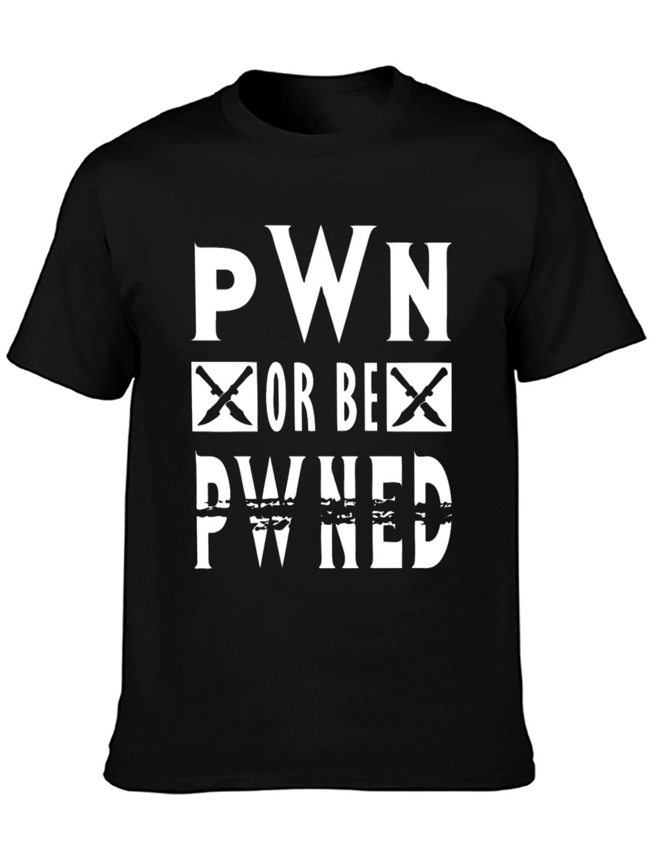 Dominate the game in this edgy black graphic t-shirt! Featuring a bold, distressed white print that reads 'PWN OR BE PWNED,' this shirt makes a statement. The striking design with crossed sword-like designs replacing the 'X' makes it the perfect pick for gamers and internet culture enthusiasts. Crafted from a comfortable-looking fabric, this tee ensures all-day wearability. Whether you're leveling up in your favorite game or hanging out with friends, this t-shirt adds a touch of rebellious style to any casual outfit.