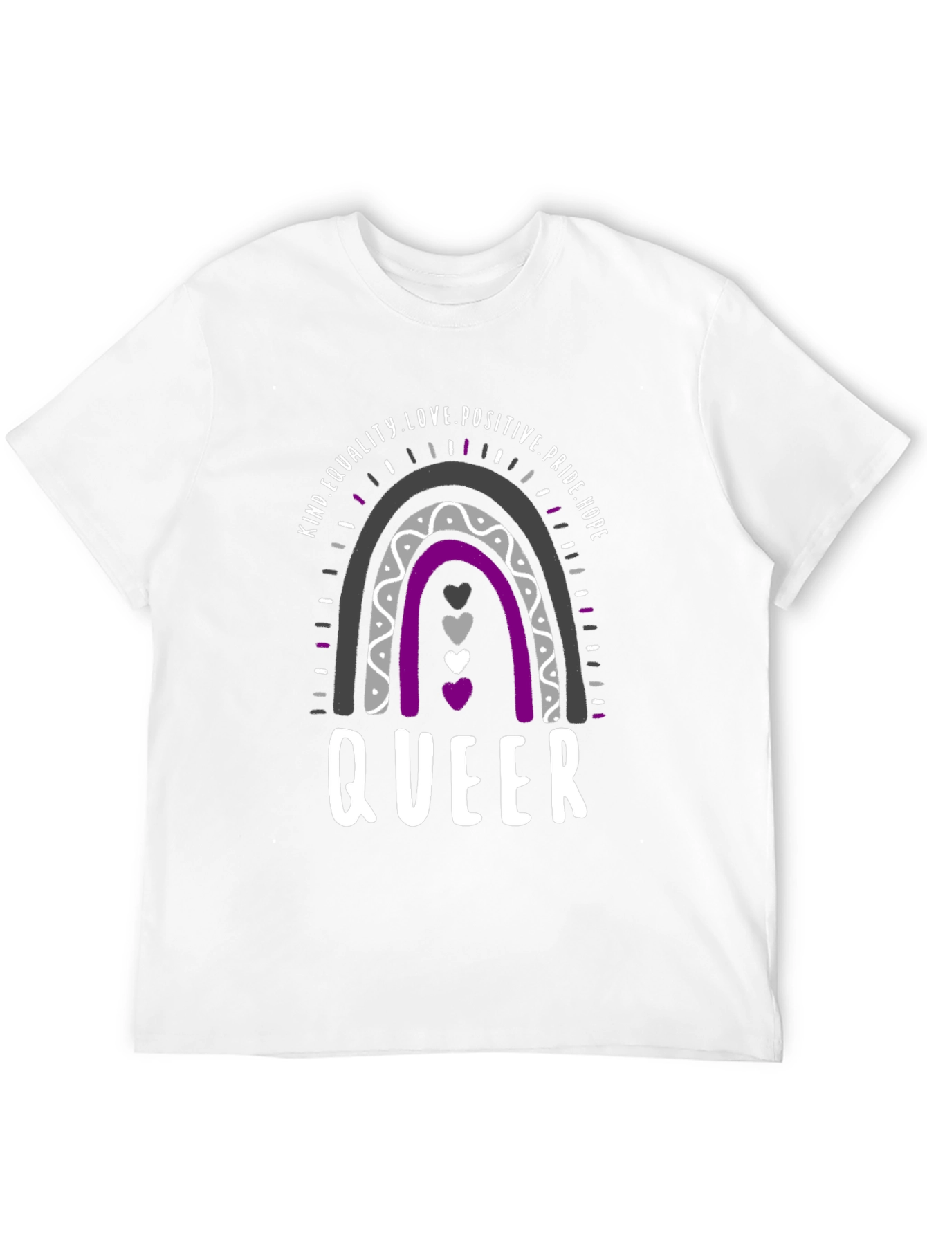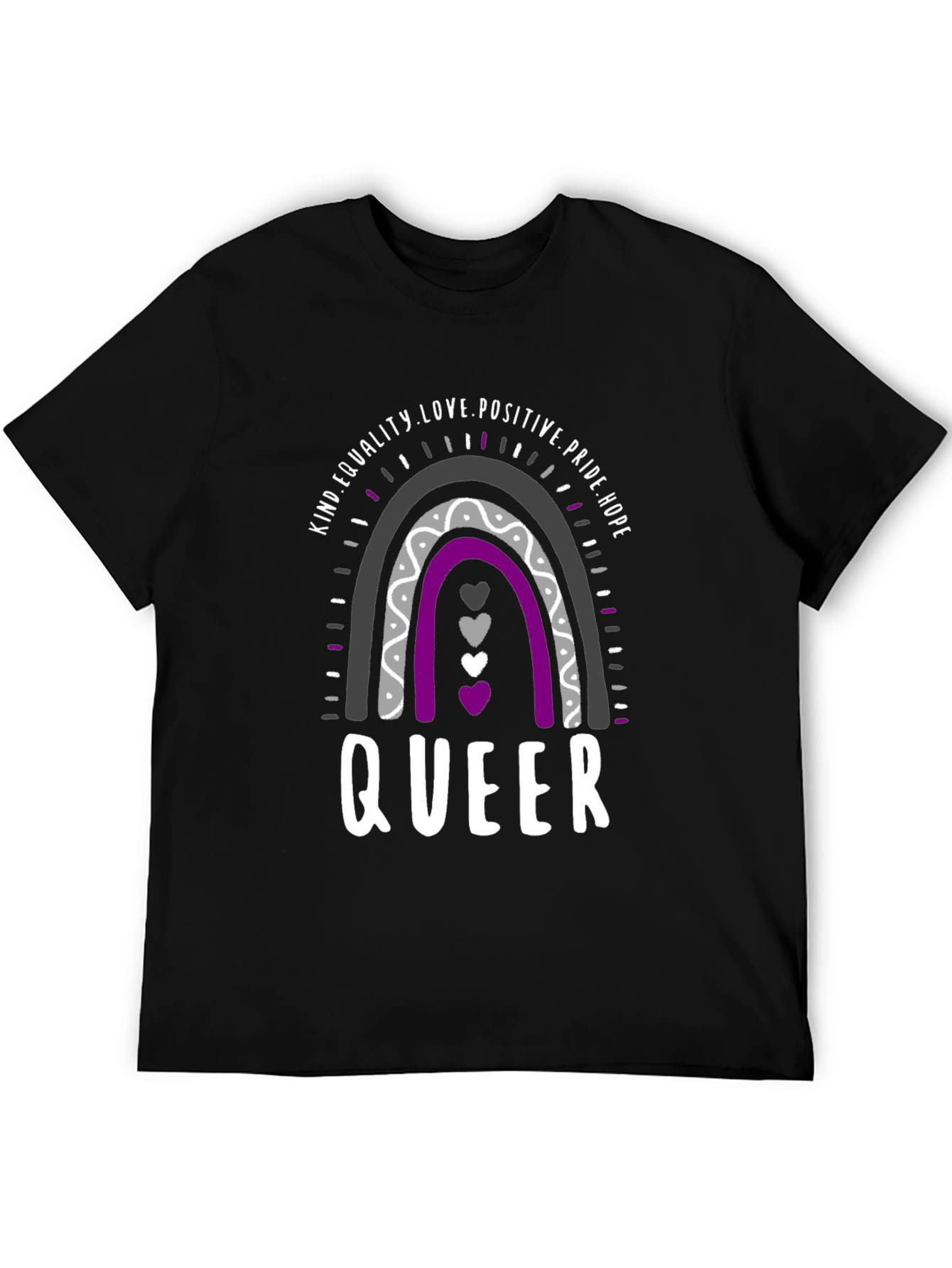 Show your pride with this stylish black t-shirt featuring a unique rainbow graphic. The rainbow design incorporates a subtle yet impactful message of 'Kindness, Equality, Love, Positive, Pride, Hope.' Underneath, the bold white lettering spells out "Queer", making a statement of identity and solidarity. Crafted from a comfortable-looking fabric, this shirt is perfect for everyday wear, pride events, or as a thoughtful gift for a loved one. Express yourself and wear your values with this eye-catching and meaningful tee. The design is also adorned with three heart shapes with grey and purple shades.