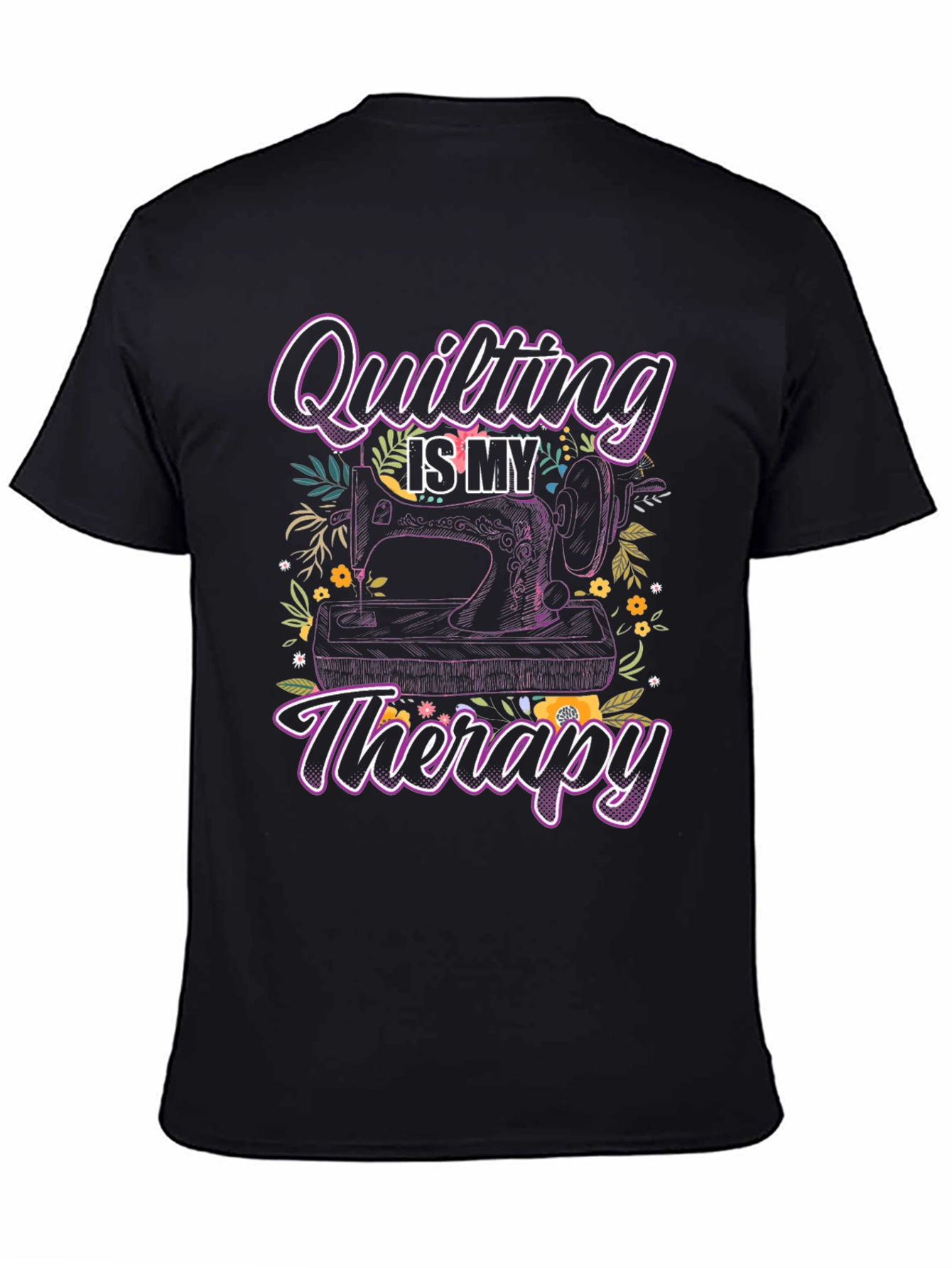 Show off your love for quilting with this stylish black t-shirt! Featuring a fun graphic design that includes the text "Quilting is My Therapy" with a vintage-style sewing machine and floral elements. This tee is perfect for sewing enthusiasts. Great for casual wear or your next quilting class. It also makes a thoughtful gift for the quilter in your life. Get yours today!