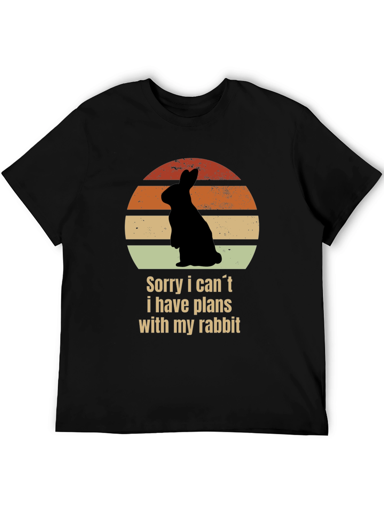 This black t-shirt features a unique graphic print with a silhouetted rabbit against a retro sunset background of red, orange, cream, and green. Bold text reads: "Sorry, I can't, I have plans with my rabbit". The unisex design makes it perfect for any rabbit lover. Made from comfortable, breathable fabric, this tee is ideal for casual wear, pet-themed events, or everyday style. Show off your affection for your furry friend with this trendy, eye-catching shirt. Makes a great gift for bunny owners and enthusiasts!