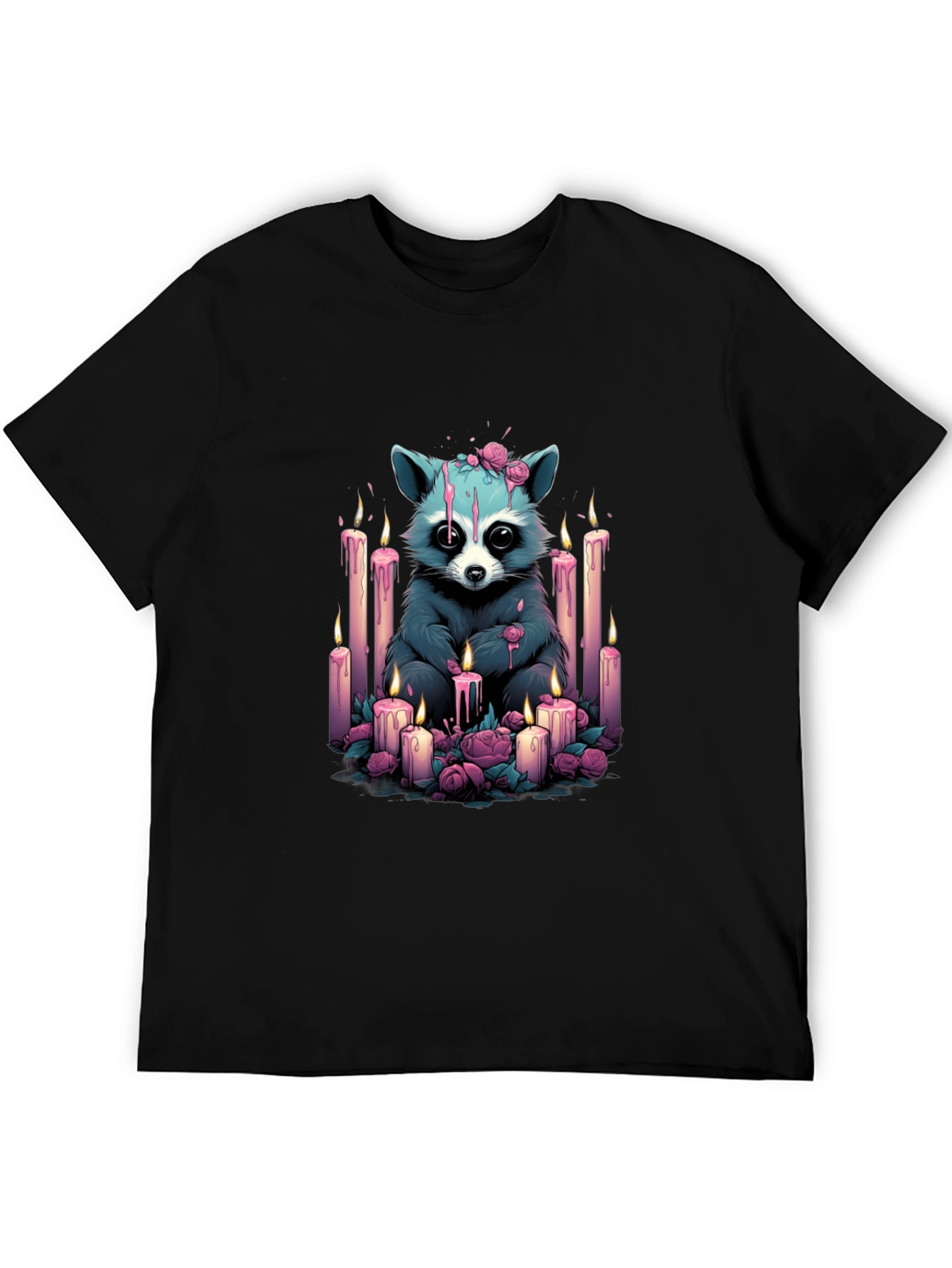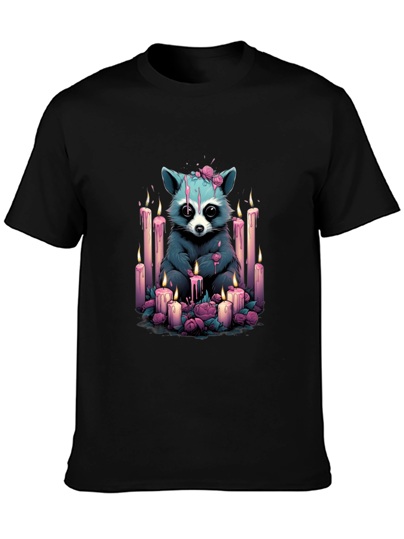 Elevate your casual style with this eye-catching graphic tee. Featuring a unique design of a charming raccoon surrounded by glowing pink candles and delicate pink roses, this shirt is sure to turn heads. The design is printed on a soft, breathable black fabric, ensuring both comfort and durability. The vibrant colors of the graphic pop against the dark background, creating a visually striking effect. Perfect for everyday wear, concerts, or as a standout piece in your wardrobe. Show off your unique style and love for animals with this must-have tee!