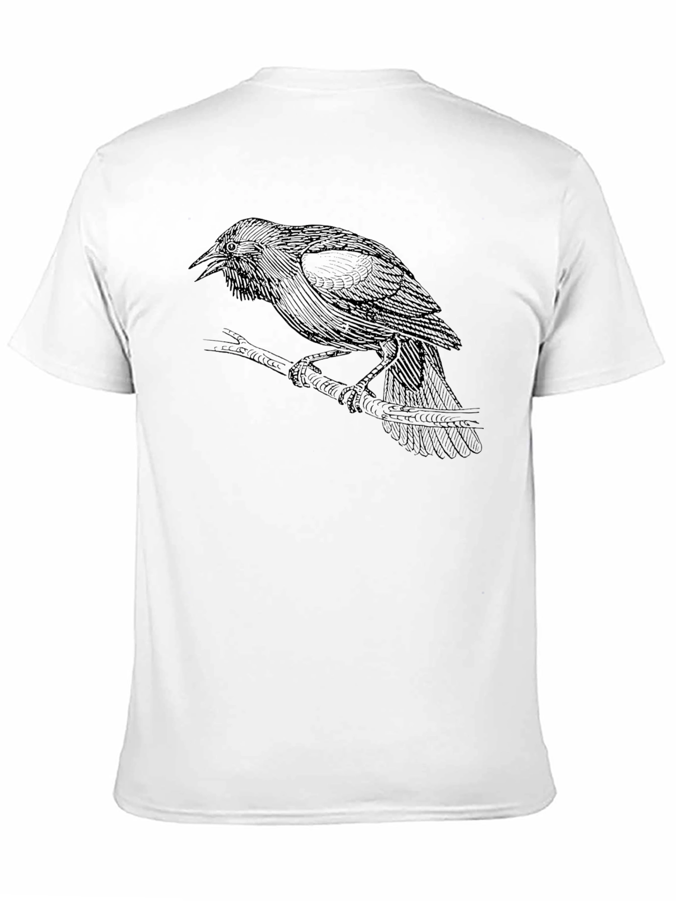 This classic black t-shirt features a striking graphic of a raven perched on a branch. The design has a detailed, vintage-inspired aesthetic. Crafted from soft, comfortable cotton, this tee is perfect for everyday wear. Its minimalist yet eye-catching design makes it a versatile addition to any wardrobe. Dress it up with a jacket or keep it casual with jeans – this shirt is sure to make a statement. Ideal for bird lovers, nature enthusiasts, or anyone who appreciates unique graphic tees. The shirt's dark color and bold design make it easy to pair with various outfits. Get yours today and showcase your unique style!