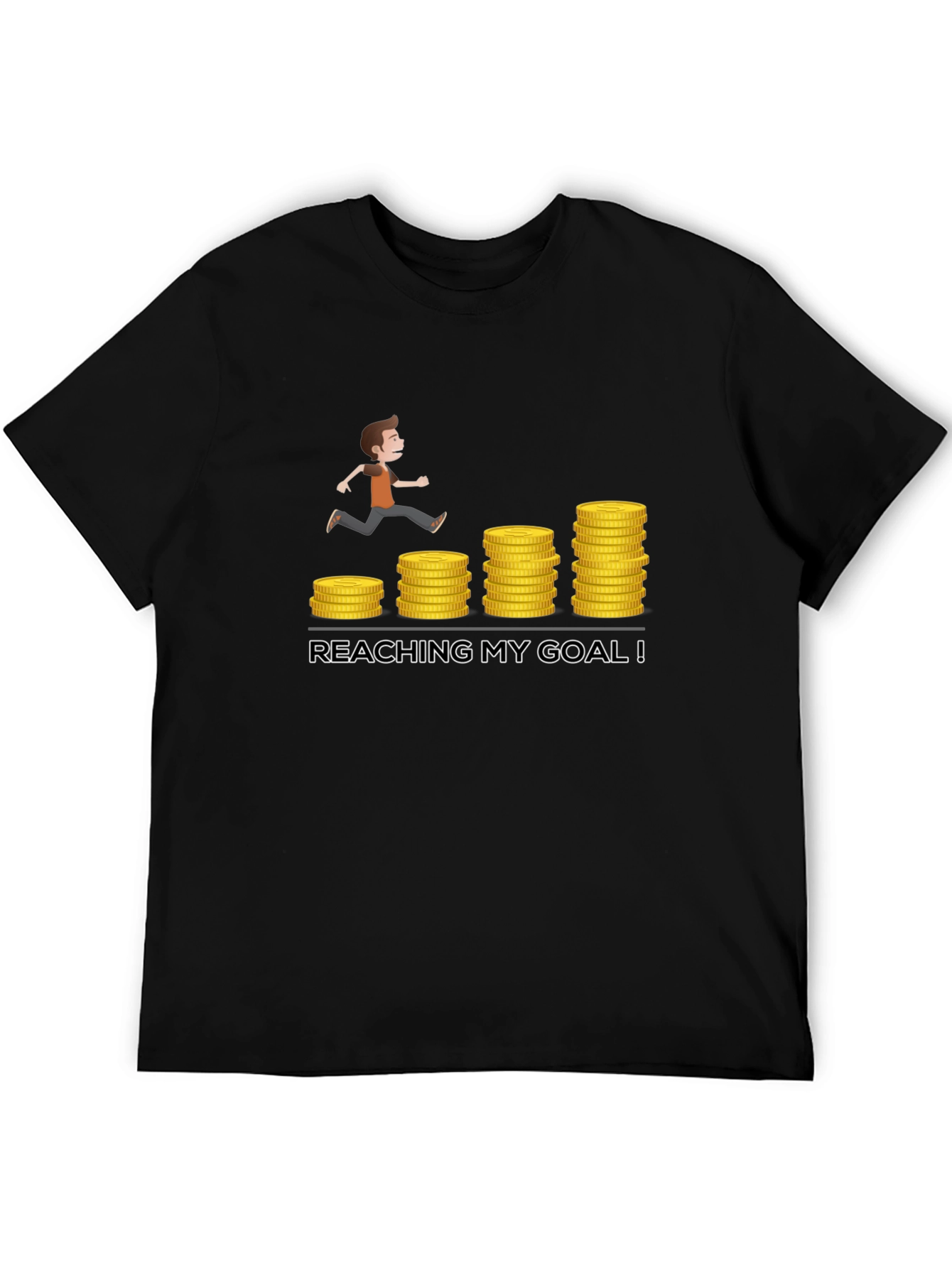 This black t-shirt features a playful graphic depicting a cartoon figure running up stacks of gold coins, symbolizing progress towards a goal. The design is complemented by the motivational phrase "REACHING MY GOAL!" in bold, white letters. Made from a comfortable-looking fabric, this tee seems ideal for casual wear, workouts, or as a reminder to stay focused on your aspirations. Its vibrant design is sure to spark conversation and inspire those around you. Wear it to the gym, to work, or while running errands for a daily dose of motivation. A perfect gift for anyone pursuing their dreams!