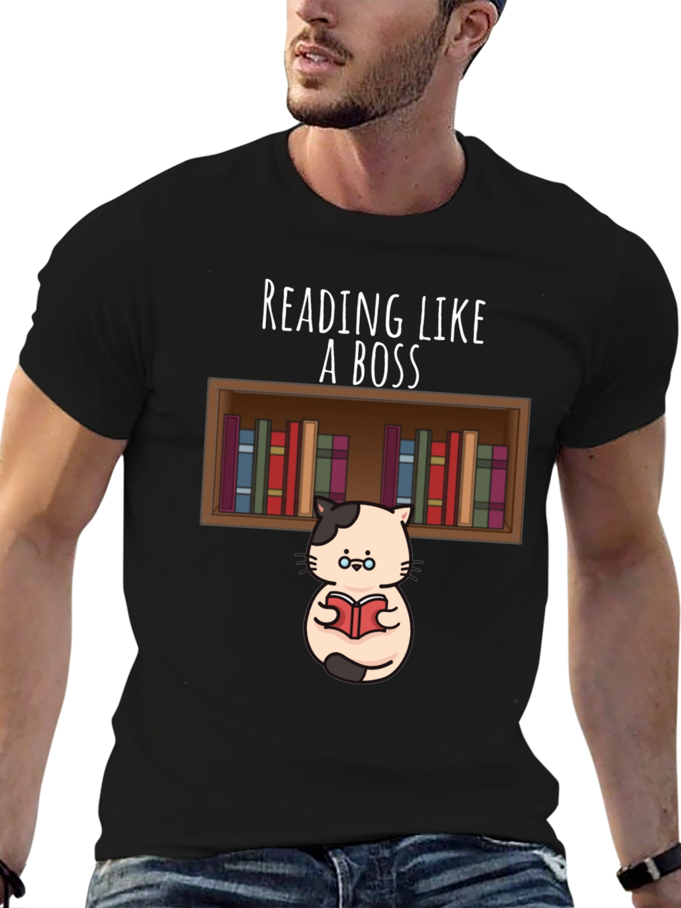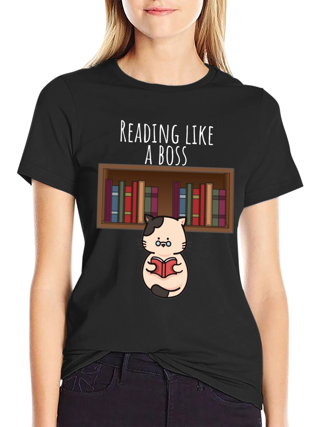 Show off your love for reading with this fun graphic tee! This black t-shirt features a cute cartoon cat with glasses, holding a book in front of a shelf full of colorful books. The phrase "Reading Like A Boss" is printed above the image. Perfect for book lovers, librarians, or anyone who enjoys a good read. This stylish and comfortable t-shirt is ideal for everyday wear, library visits, or casual outings. Makes a great gift for the bookworm in your life!