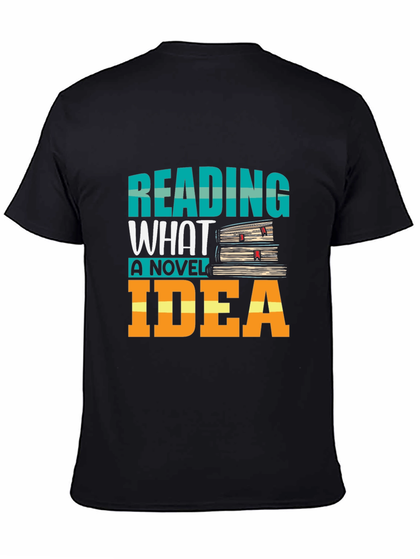 This stylish black t-shirt features a fun graphic design that celebrates reading. The design includes the words "READING" in a teal color, "WHAT A NOVEL" in white, and "IDEA" in a vibrant orange. A stack of books with red bookmarks adds a charming touch. Made from comfortable, breathable fabric, this shirt is perfect for casual wear. It's an ideal gift for bookworms, librarians, teachers, or anyone who loves a good story. Show off your passion for reading with this unique and eye-catching tee. Great for wearing to book clubs, libraries, or just lounging around with your favorite novel.