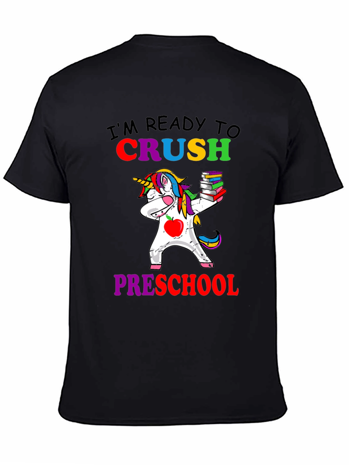 Get your little one ready for preschool with this adorable black t-shirt. Featuring a vibrant, cartoon-style unicorn graphic doing the 'dab' pose, holding a stack of books and sporting a red apple, this shirt is perfect for the first day of school or any day! The playful text "I'm Ready to CRUSH Preschool" adds a fun and motivational touch. Made from what appears to be a soft, comfortable cotton blend, this tee is both stylish and easy to wear. Let your child express their excitement for learning with this unique and eye-catching t-shirt!